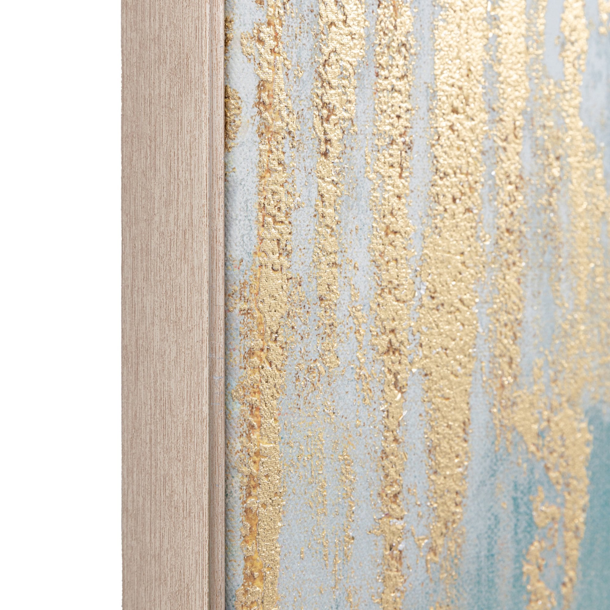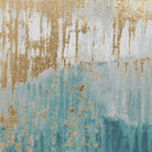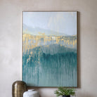 Awaken your walls with the luminous beauty of this canvas. This captivating piece captures the serene essence of dawn, with soft hues of blue and green gently kissed by shimmering gold accents.
