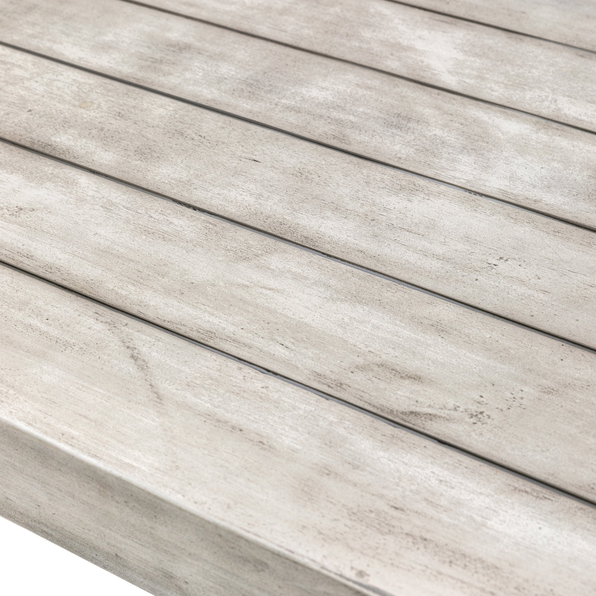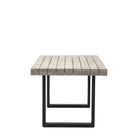 This stylish outdoor dining table features a rectangular top with a weathered acacia wood finish and striking black metal legs. The table's industrial design adds a modern edge to any outdoor space. Its sturdy construction and spacious surface make it perfect for hosting gatherings or enjoying meals al fresco. This table can be paired with matching chairs or benches to create a complete and coordinated dining set.