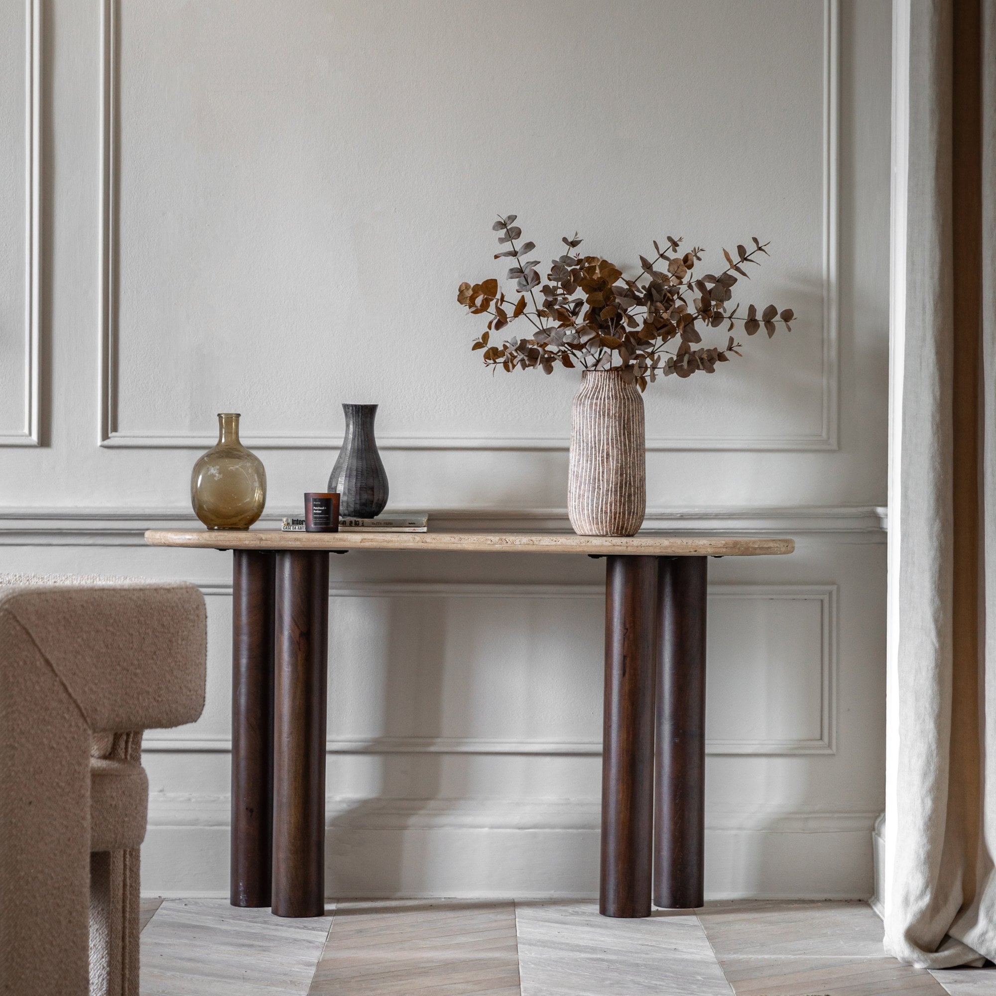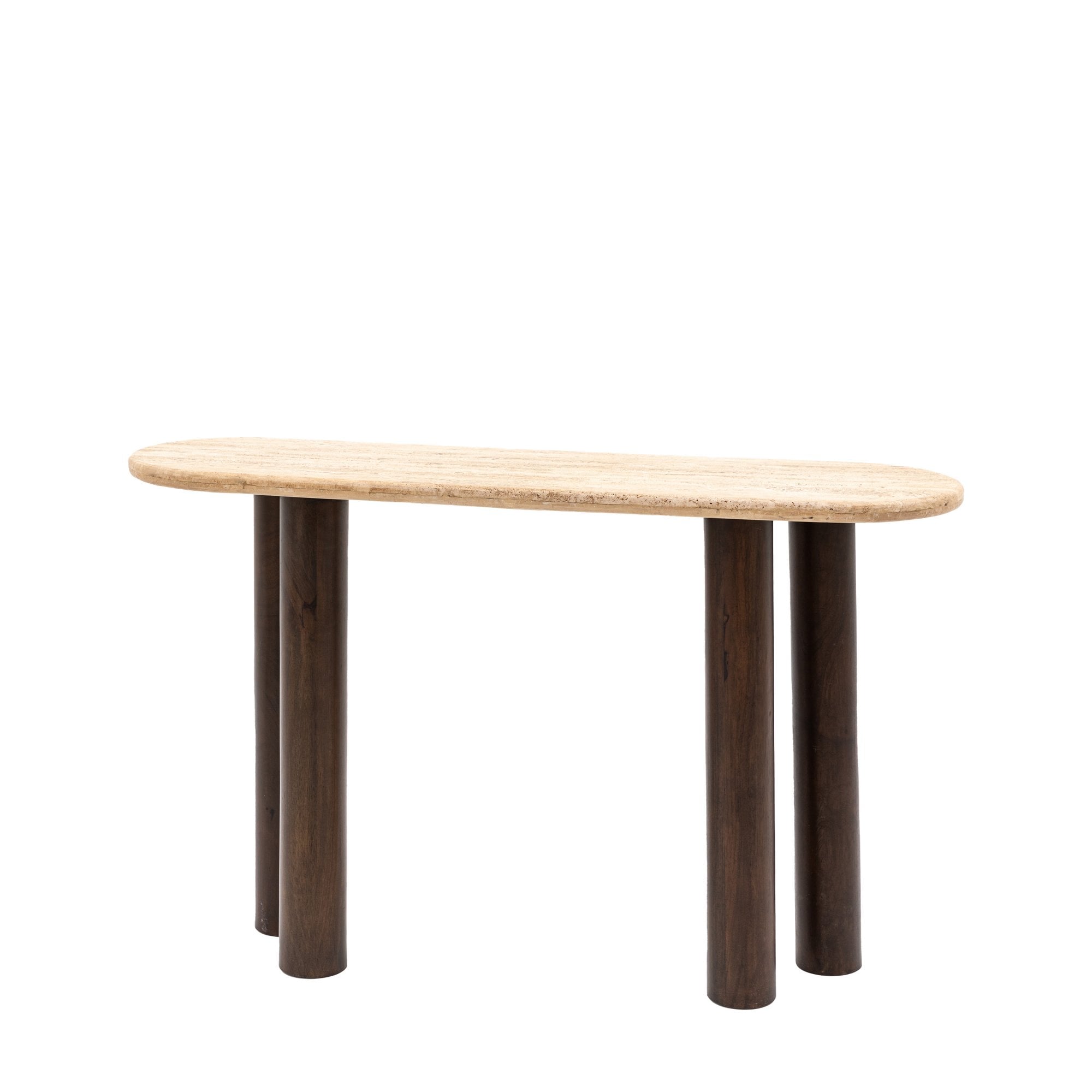 This stunning console table features turned cylindrical legs, crafted from mango wood solids, paired with a solid travertine stone top which has a natural finish.