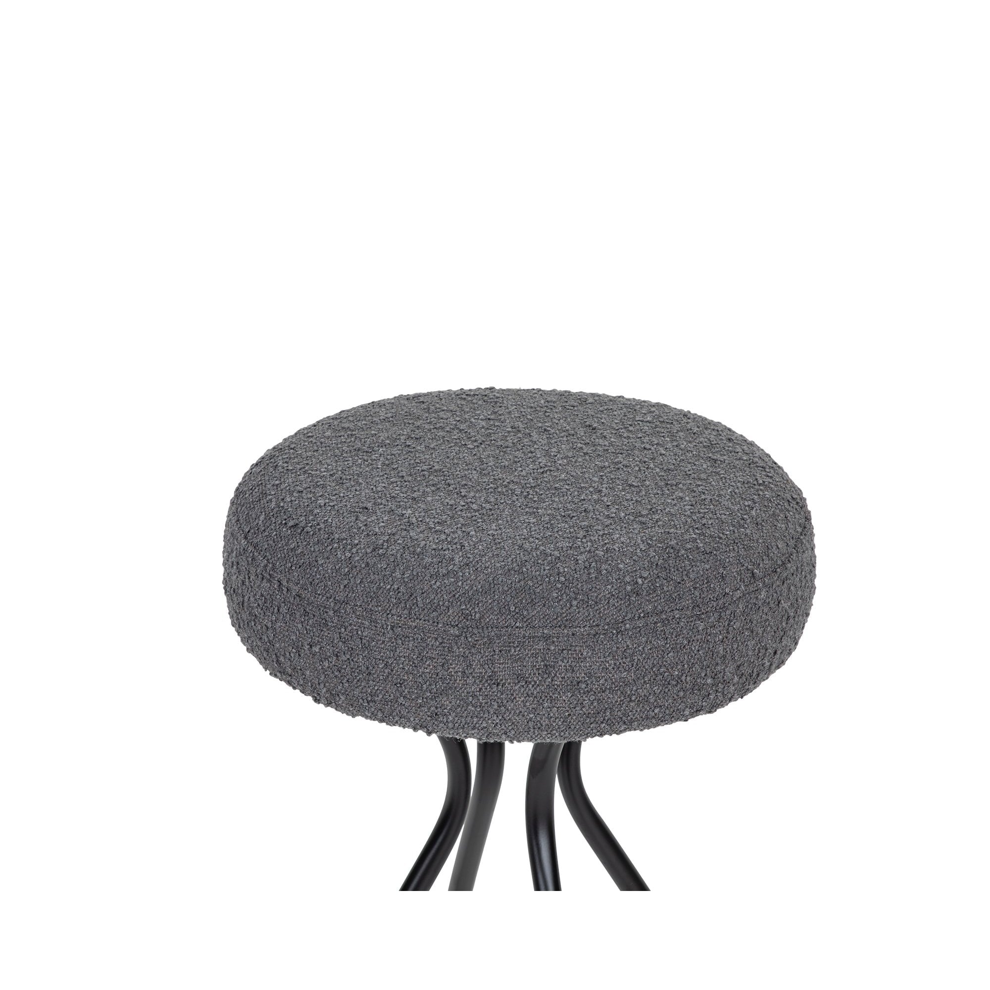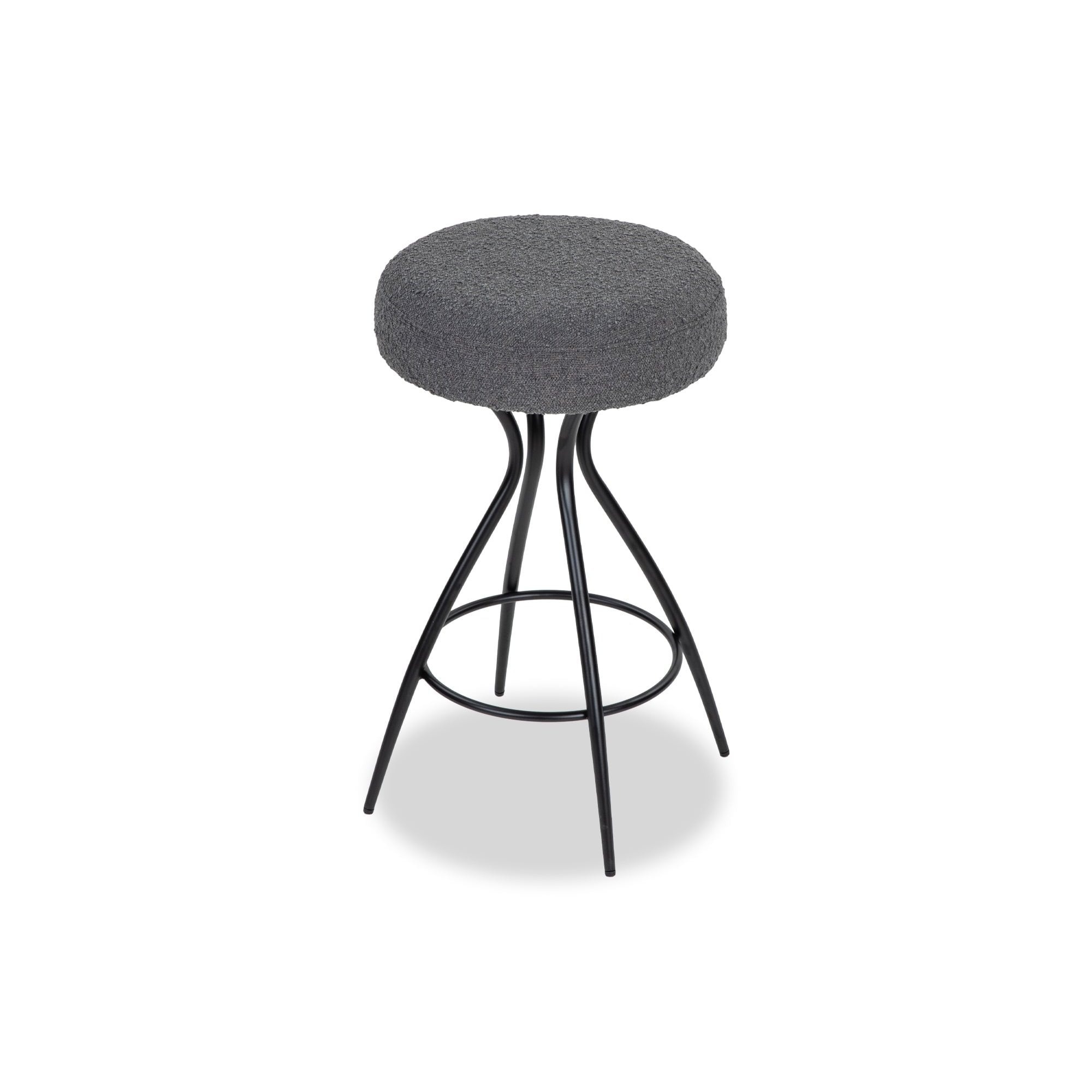 The Hydra Counter Stool in Boucle Graphic Grey offers a modern aesthetic with a comfortable padded seat and sleek hourglass base. Ideal for casual dining or stylish café settings, it elegantly enhances any space with its sophisticated design.