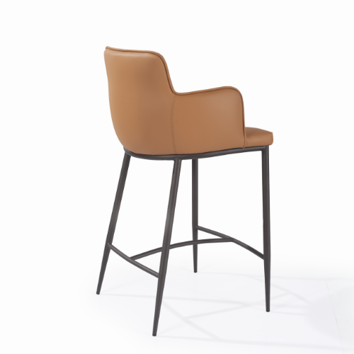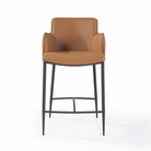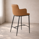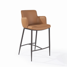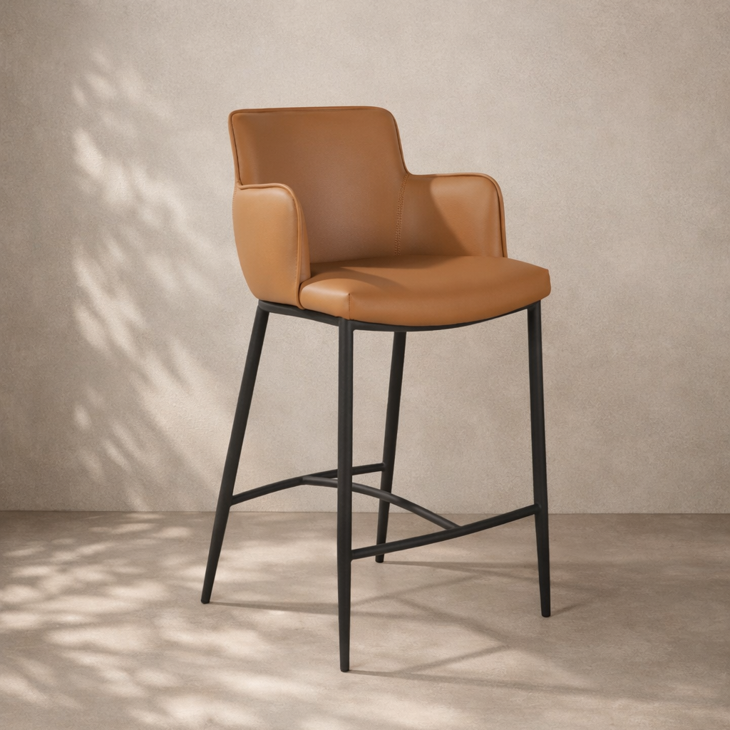 The Kim Counter Stool in Tan combines contemporary style with everyday comfort, making it a refined addition to kitchen islands, breakfast bars, and home entertaining spaces. Upholstered in smooth cognac faux leather, the stool introduces warmth and sophistication while maintaining a sleek, modern aesthetic. The softly contoured seat features supportive armrests and a gently curved backrest, creating a comfortable wraparound design ideal for relaxed seating. Slim metal legs in a dark finish give the stool a light, modern silhouette, while the integrated footrest adds practical support for longer seating. Elegant and versatile, the Kim Counter Stool blends clean lines with inviting comfort, making it a stylish choice for modern interiors.