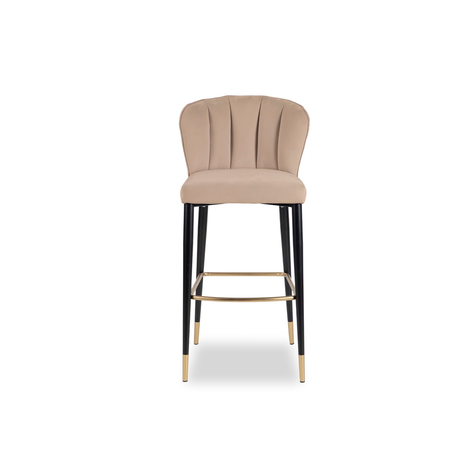 Introducing the Maya Bar Stool, where contemporary design meets ultimate comfort. Upholstered in luxurious Kaster Mushroom Velvet, it features striking matt black steel legs complemented by gold-finished feet and footrest. The armless design ensures ease of movement and promotes a relaxed seating experience, making it the perfect choice for dining or entertaining. The timeless elegance of this bar stool is a must-have for both residential and hospitality spaces.
