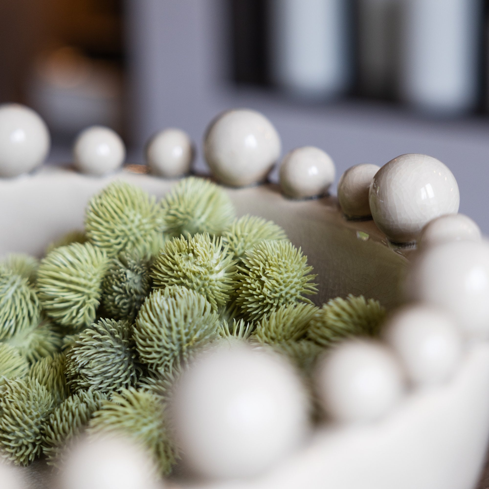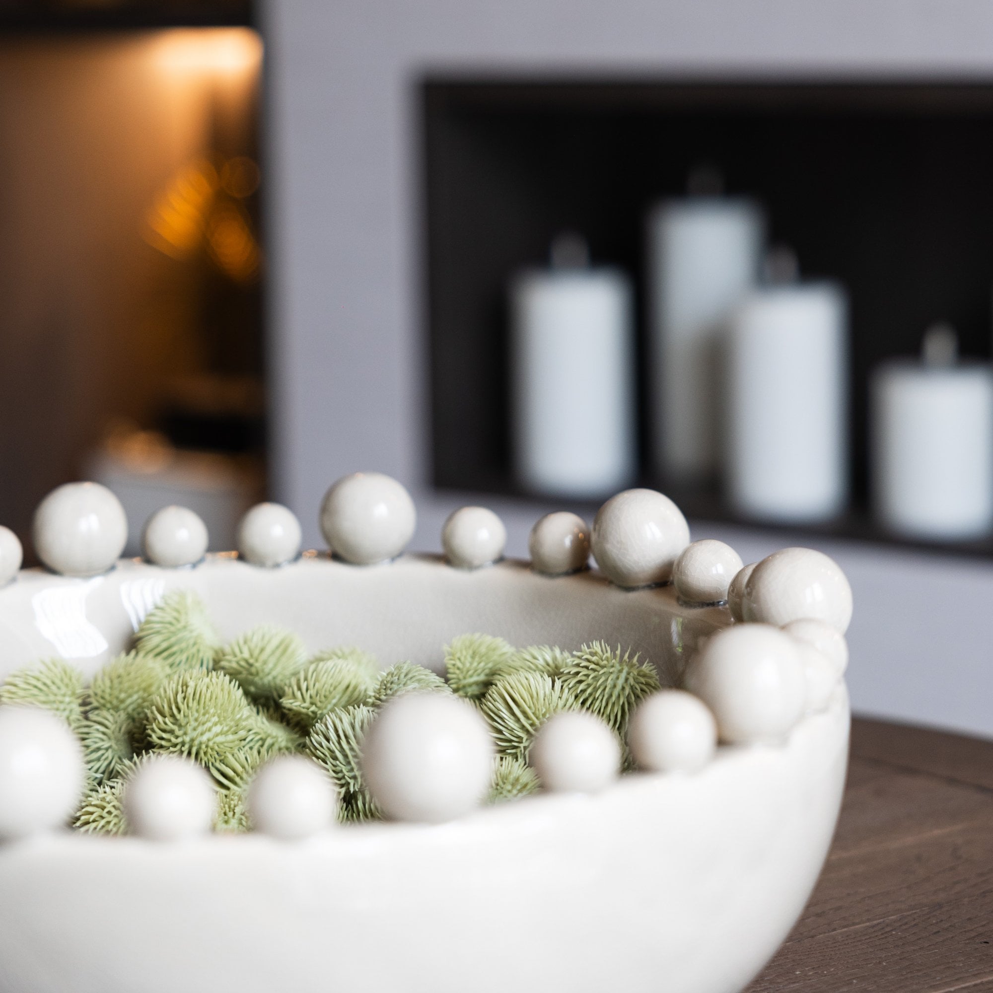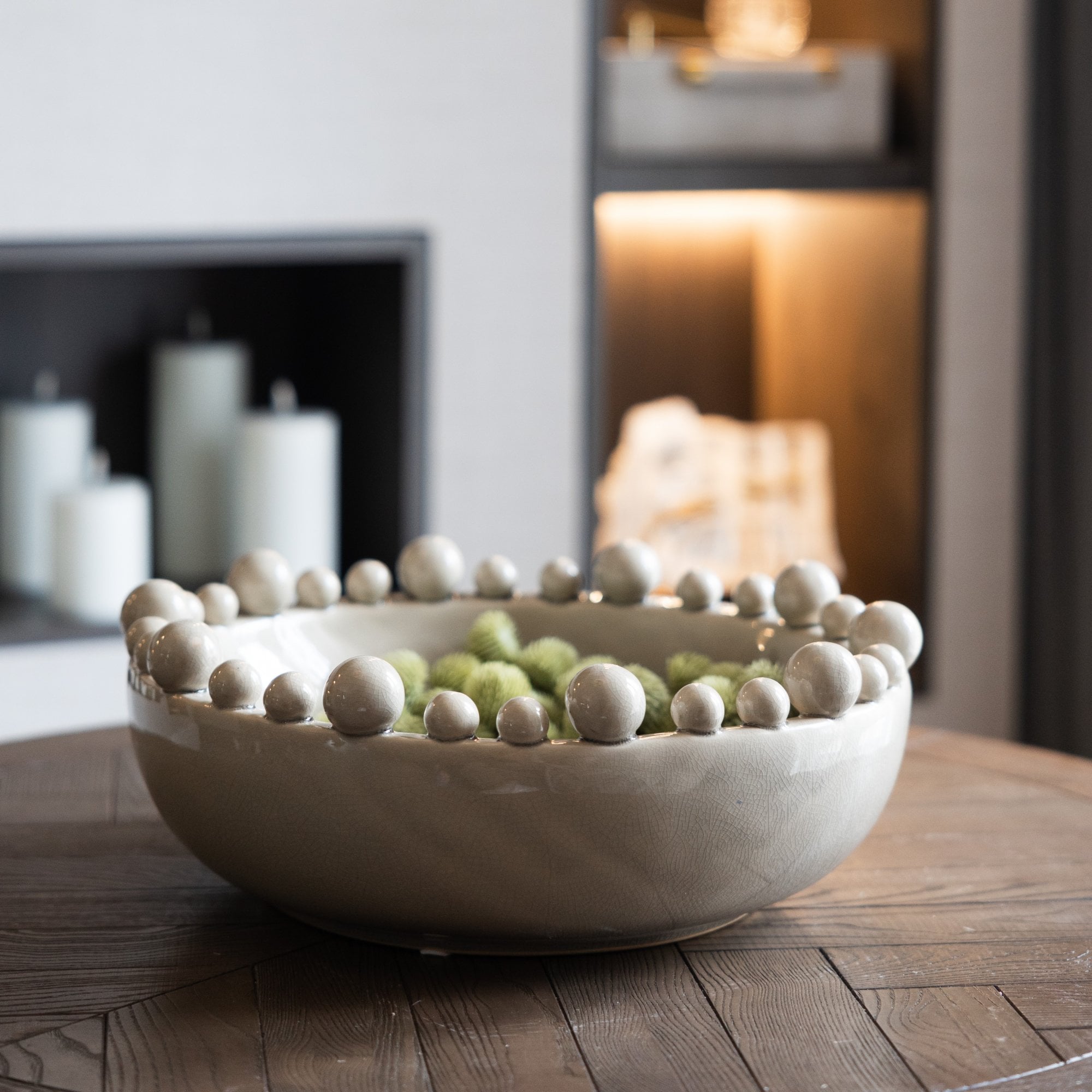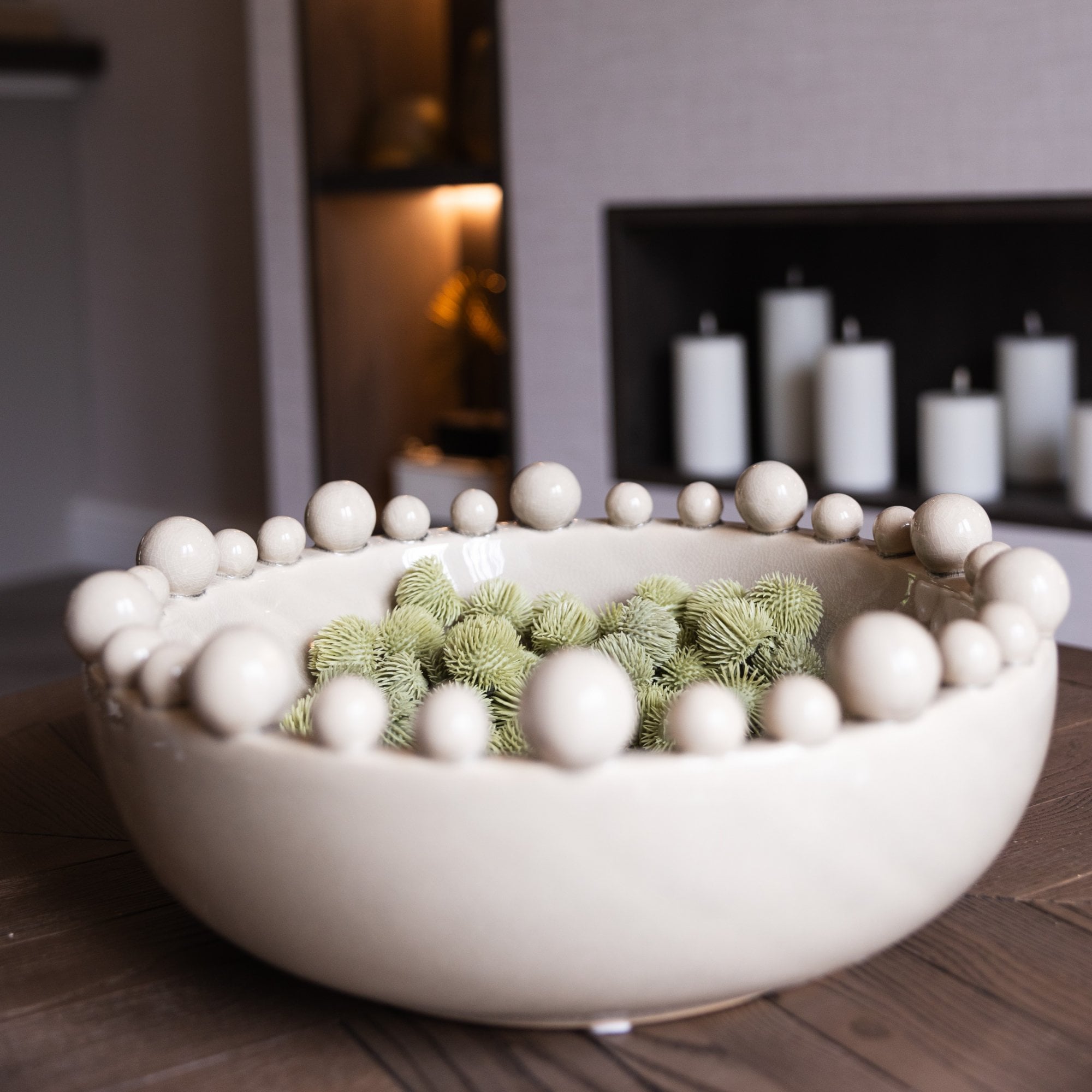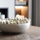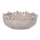 Cream Bobble Edged Bowl, a vision of understated beauty. The creamy hue imparts a sense of warmth and timeless elegance, while the bobble edges add a touch of playfulness. With a glazed finish to enhance its sophistication, this bowl becomes a refined centerpiece for your decor - subtle, yet undeniably chic.