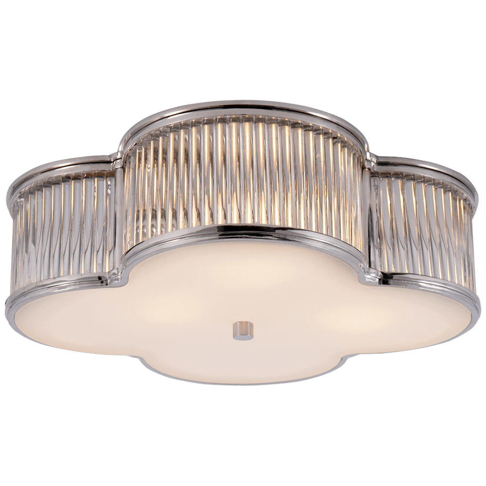 The fixture boasts a modern clover-shaped (quatrefoil) metal frame with scalloped edges and vertical ribbed detailing, contributing to its distinctive silhouette. The polished nickel finish offers a sleek and reflective surface, adding a touch of sophistication to the room. The light is complemented by a frosted glass diffuser that softens and evenly distributes the light, creating a warm and inviting ambiance.