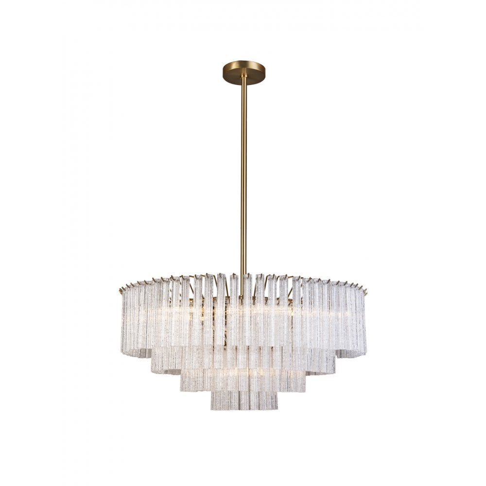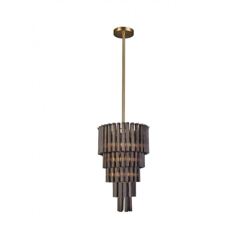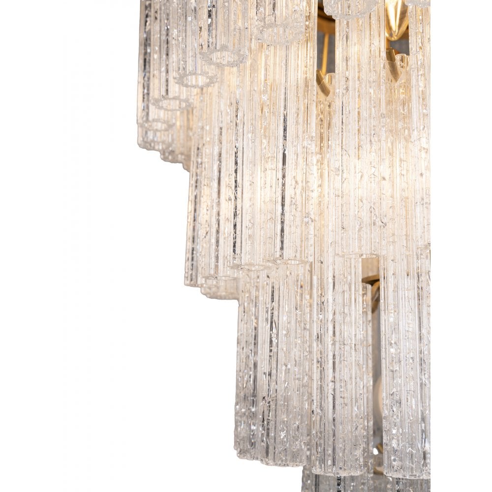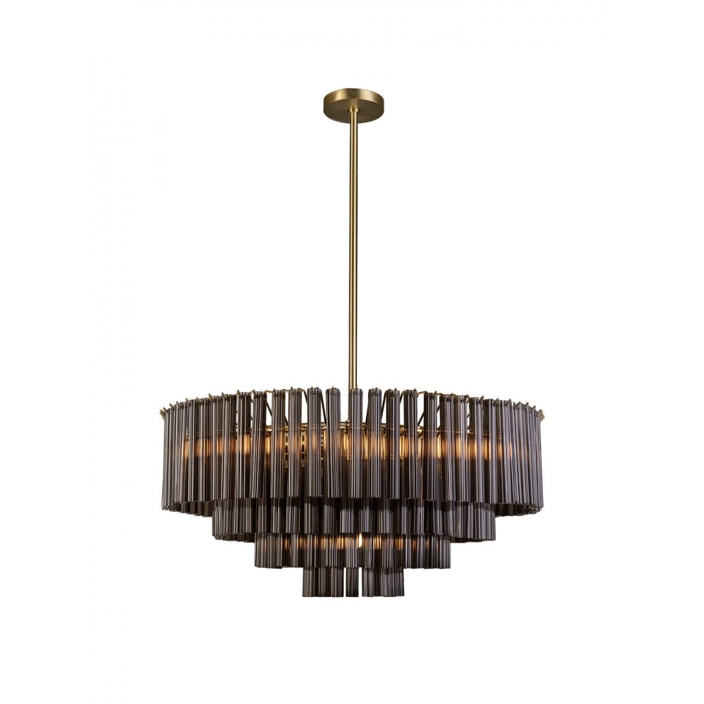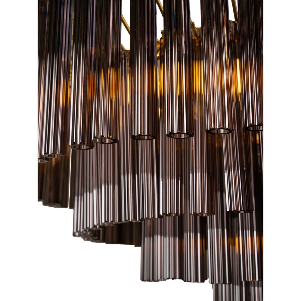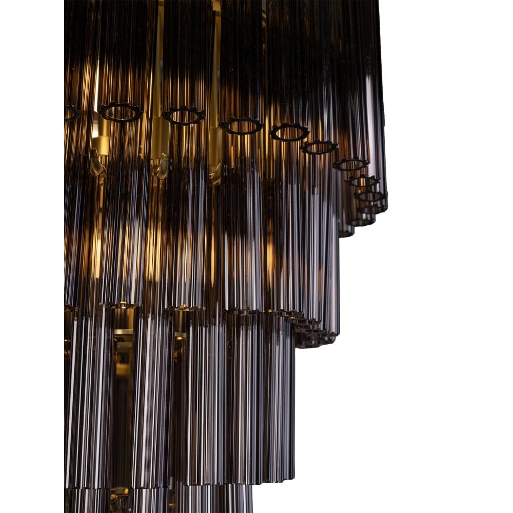 Meet Sloane — a showstopping chandelier with 171 Smoke or Crackle-finished, fluted glass tubes arranged over four elegant tiers, individually suspended by sleek Satin Brass metalwork. This chandelier adds a touch of modern luxury and warmth, perfect for making a statement.
