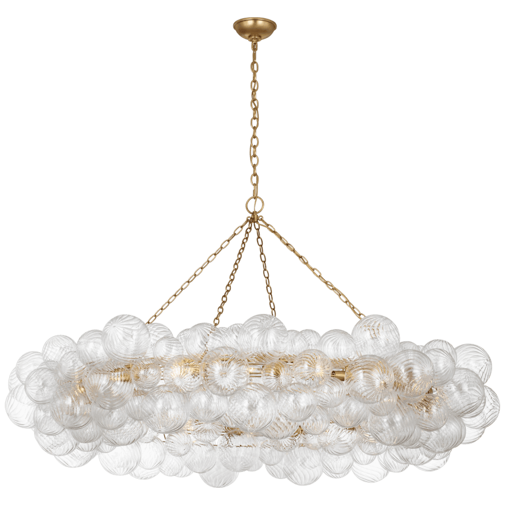 The Talia Ring Chandelier is a striking fusion of sculptural elegance and modern glamour. Finished in a radiant gold gild, its sleek circular frame is adorned with clear swirled glass elements that catch and refract light from every angle. The hand-formed glass adds depth and movement, creating a soft, luminous glow that elevates any space.