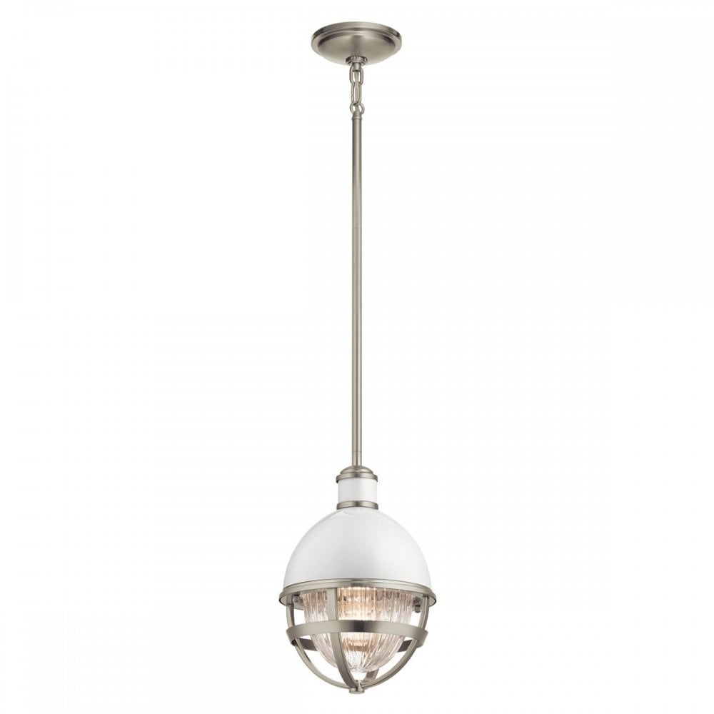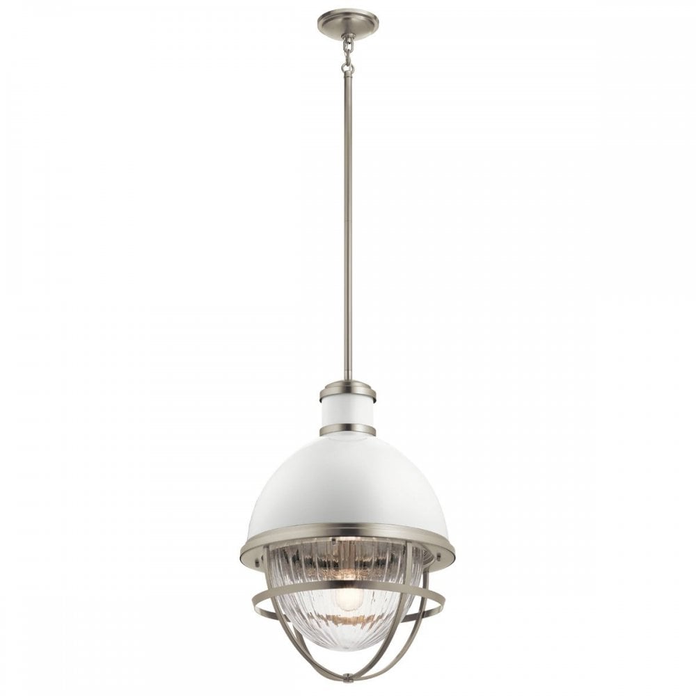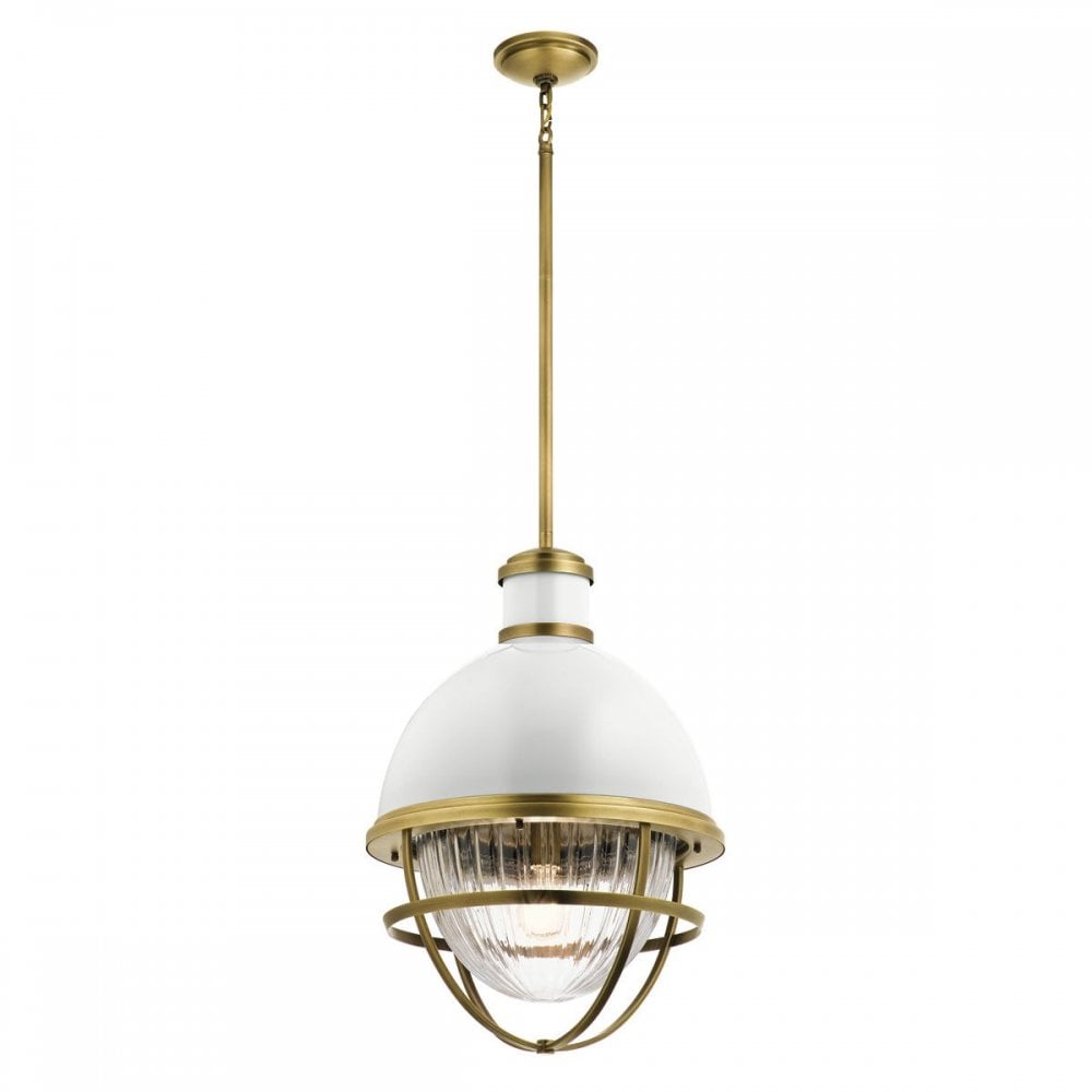 Fresh and stylish, the Tollis™ oversized pendant is oval shaped and inspired by nautical lamps from the past. Designed with a high gloss white dome, clear ribbed glass, and a Natural Brass finish to help set the tone for a relaxing atmosphere.