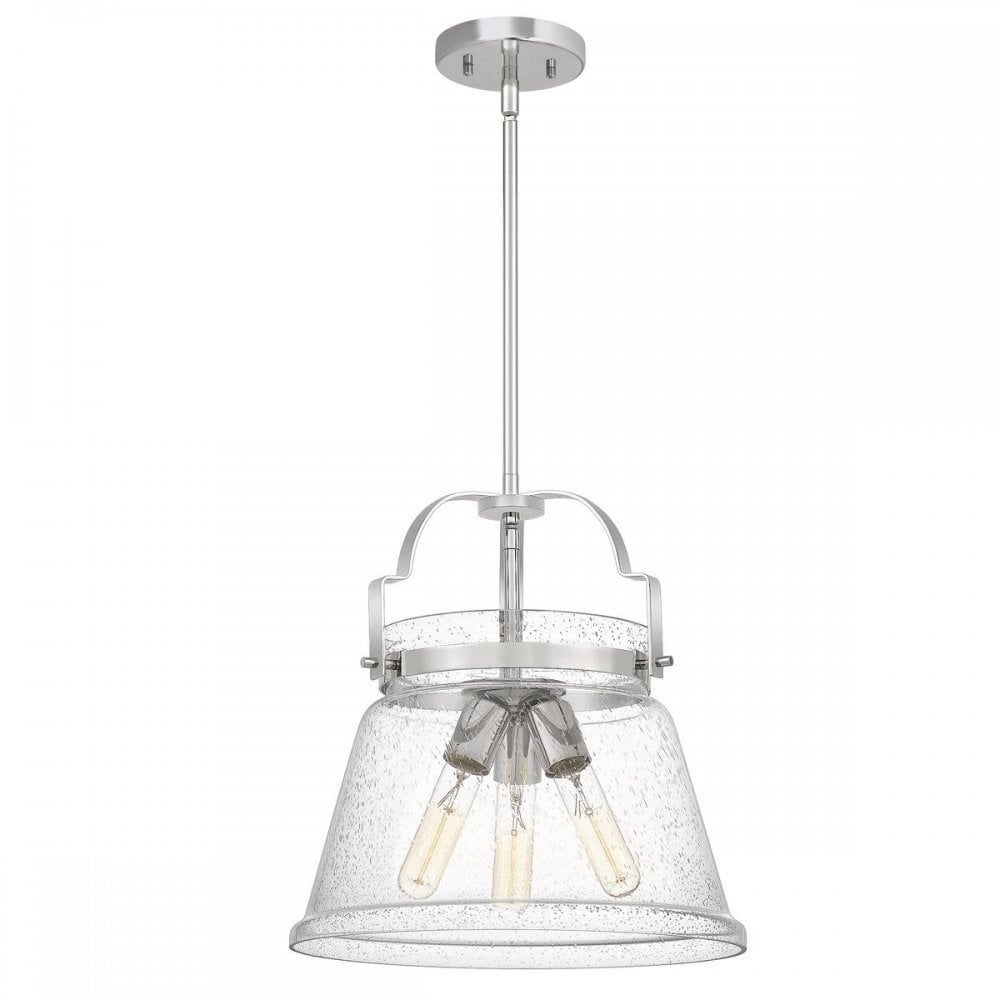 Wimberley is an oversized bell shaped, seeded glass shade with Polished Chrome metalwork. This vintage design will sit comfortably in any modern or transitional kitchen or bar.