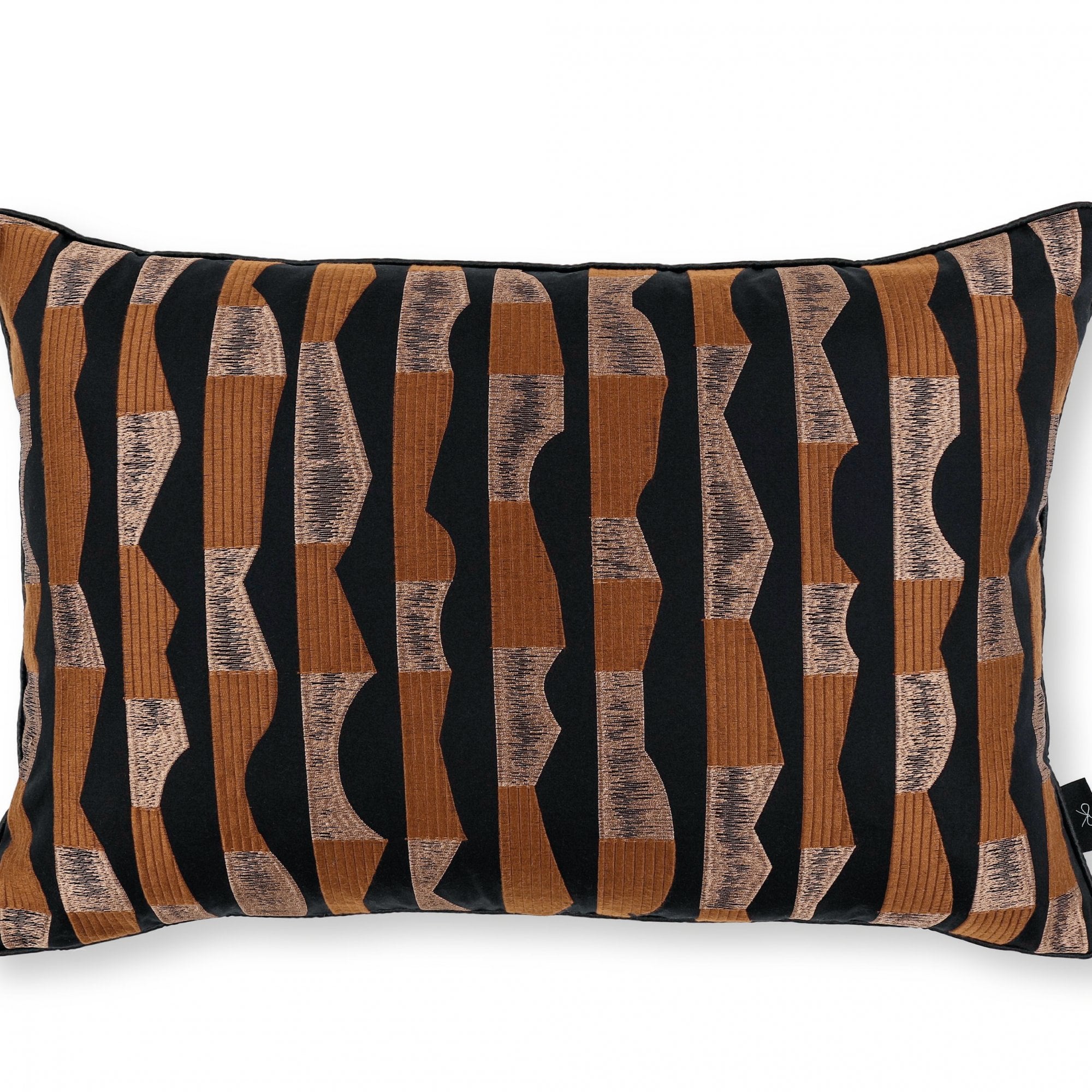 The Ozari cushion exudes a sharp, arresting appearance as sculptural, geometric blocks are perfectly embroidered on a smart cotton satin, forming a contemporary stripe design.