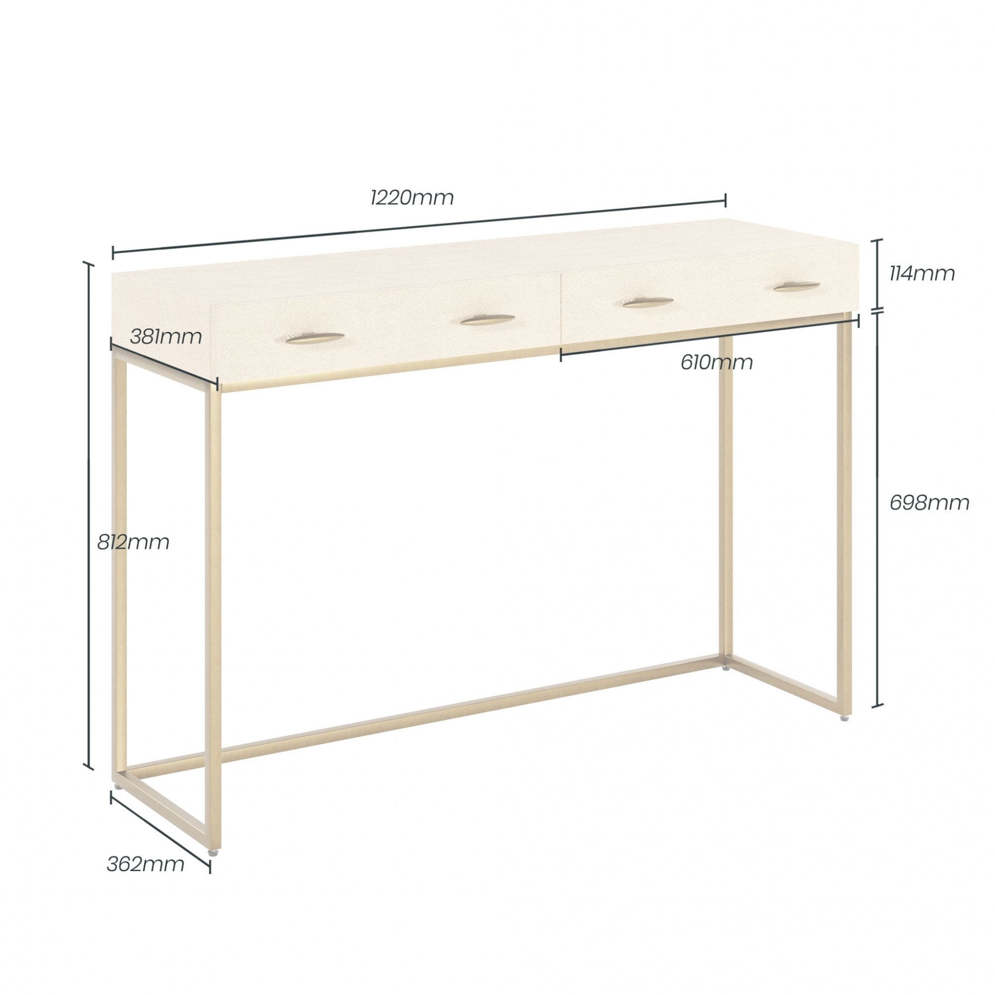 D.I Designs Hampton two drawer ivory console table, faux shagreen, antique brass style handles and legs, drawers on metal runners, walnut style wood on inside of drawers.