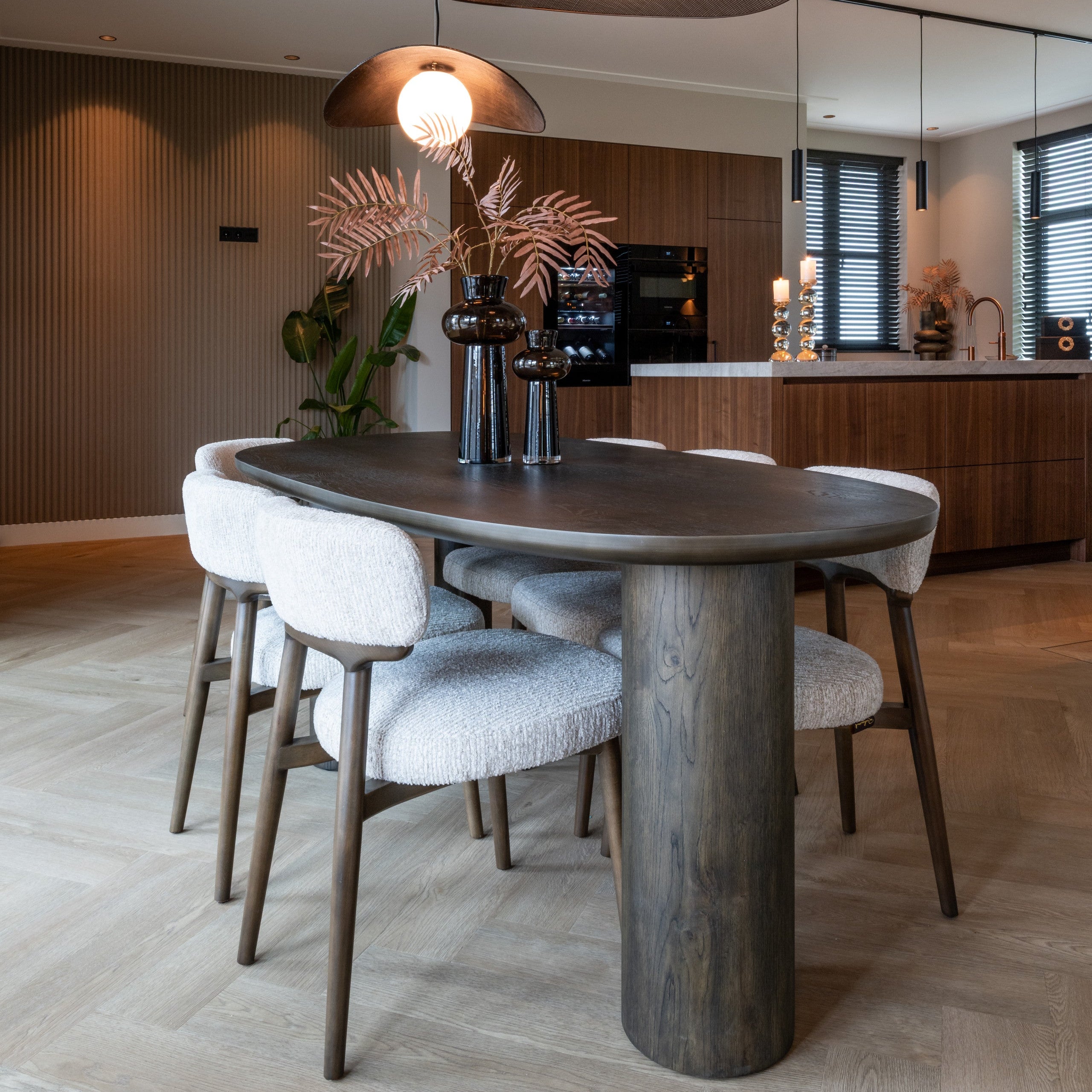 Dining table Ellington is crafted from oak veneer in a deep brown tone. The structured base and rounded edges create a solid yet elegant presence.