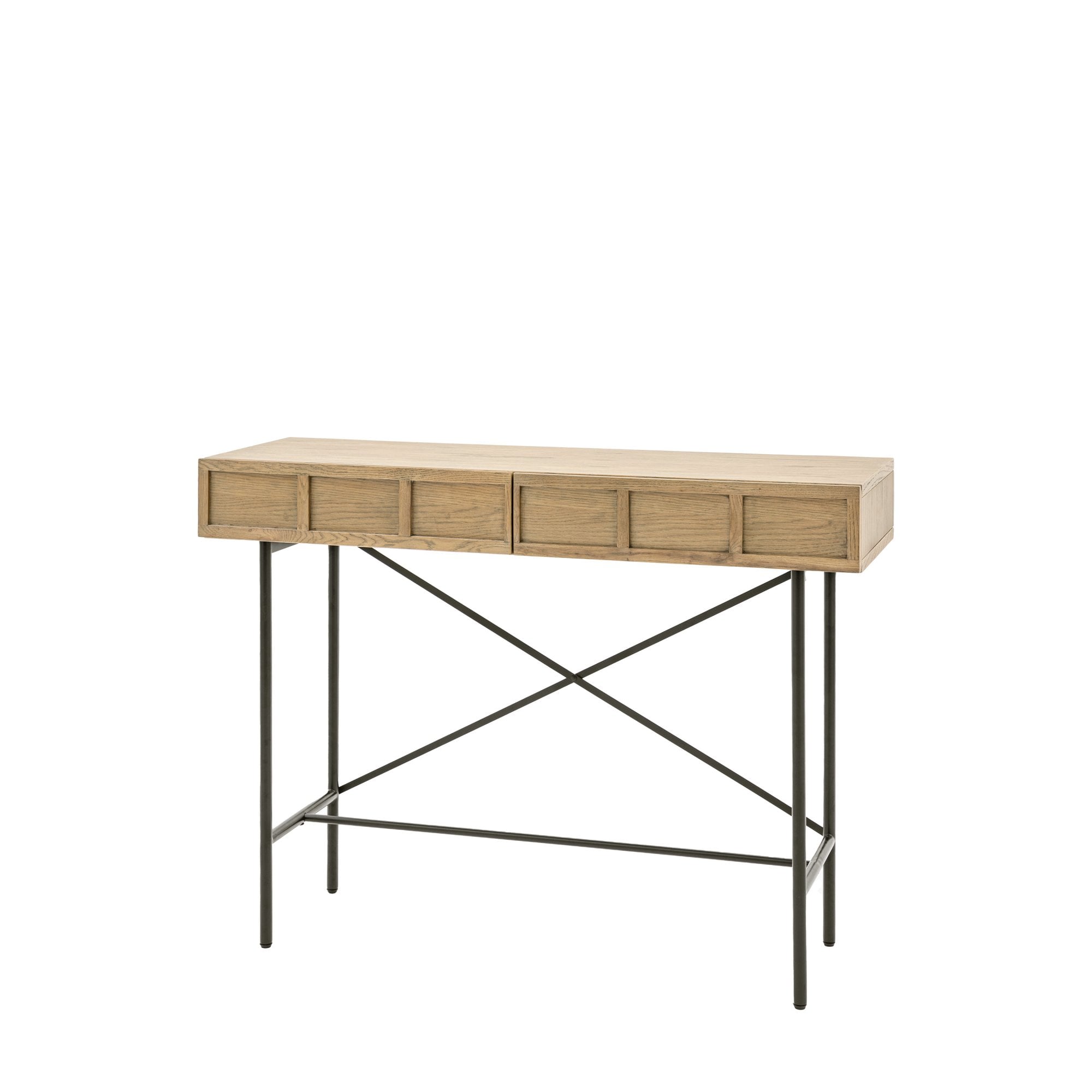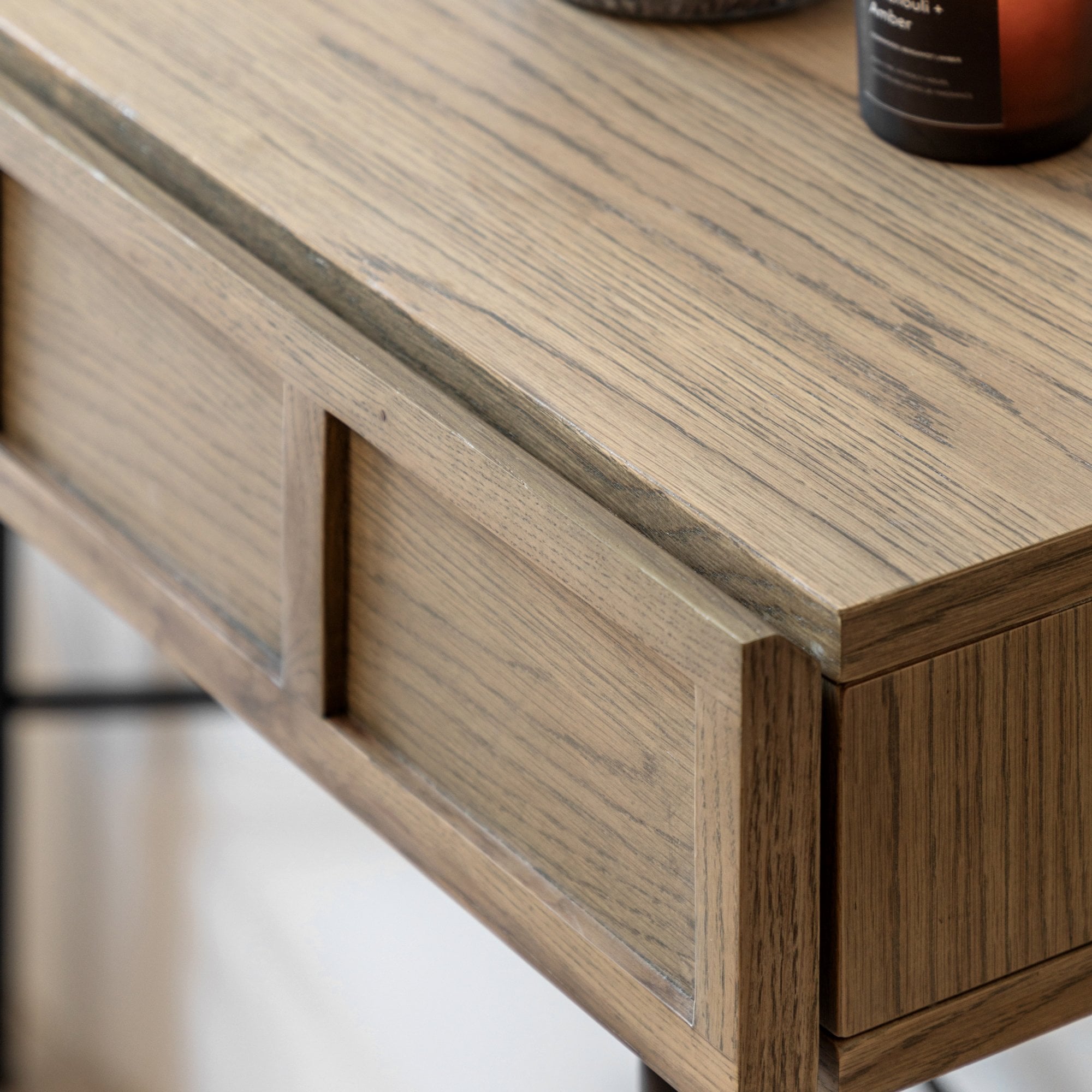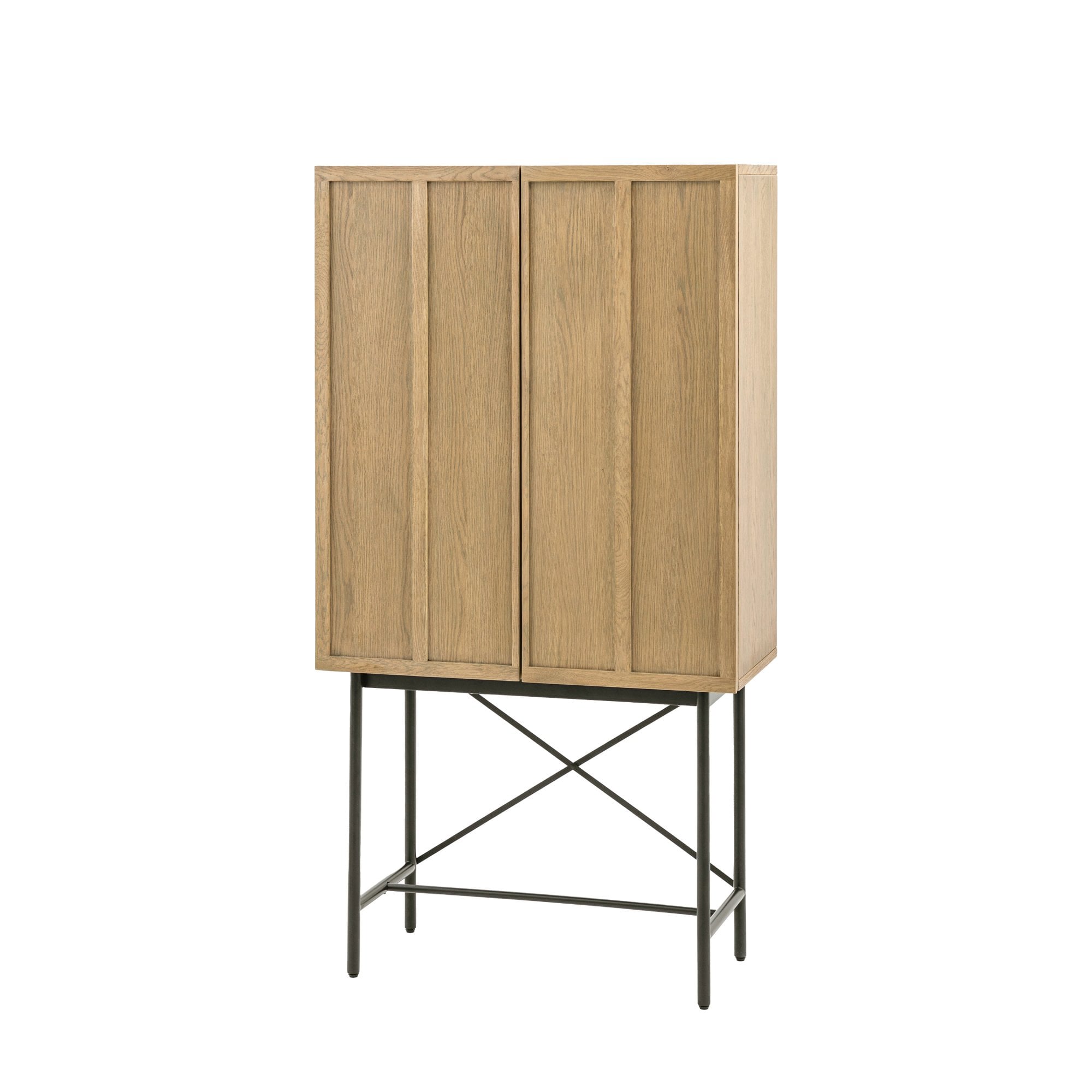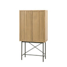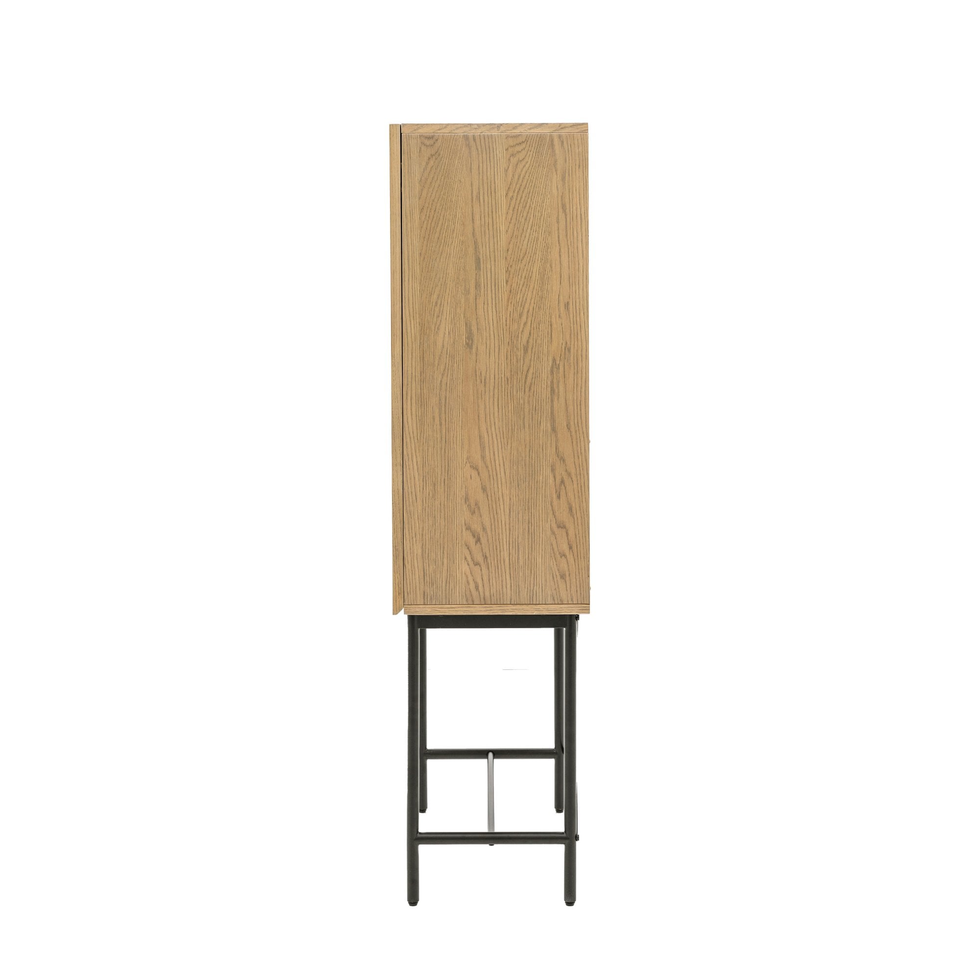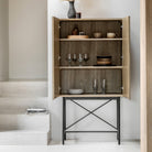 Designed for modern apartment living, this beautiful cocktail cabinet would look equally at home in a variety of interiors. It has retro style panelled fascias in oak veneers and solids with a weathered grey finish, paired with black metal legs and underframe. Matching pieces are available.