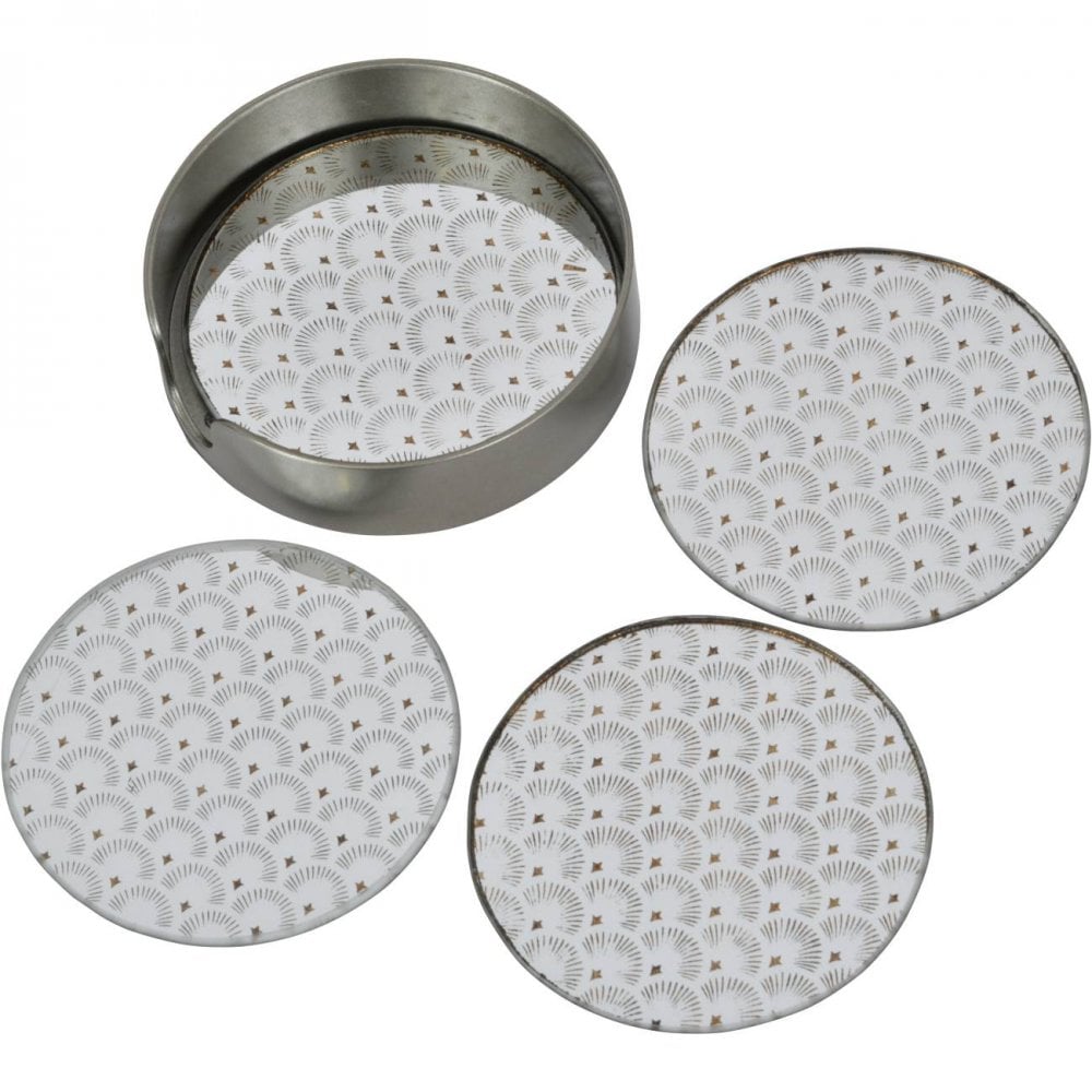 This set of 4 coasters is presented in a beautiful golden scallop printed finish on mirror glass and matches our larger scallop trays for a sleek dinnerware set you’ll love.