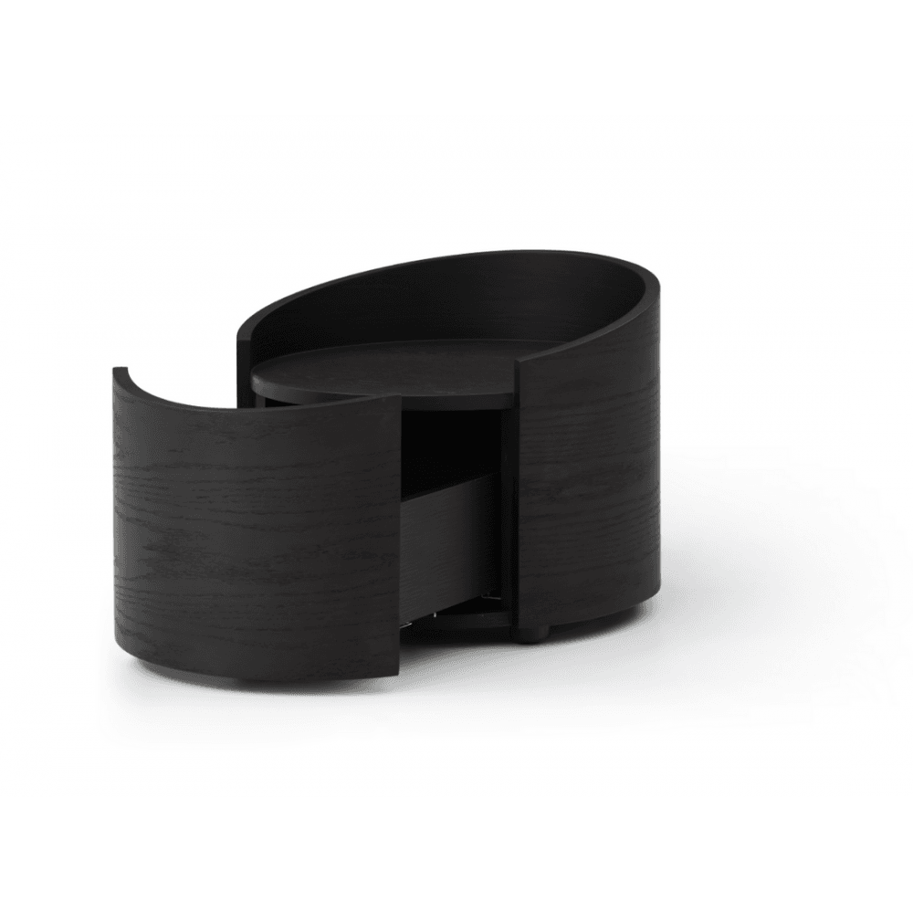 The Amond Bedside Table embodies a perfect blend of modern aesthetics and functional design. Its distinctive round silhouette immediately captivates the eye, lending a unique and contemporary touch to any bedroom. The table features a back top lip that adds a subtle yet defining element, enhancing both style and practicality. The smoke oak veneer finish not only imparts a sophisticated charm but also ensures durability. The smooth curves of the table further contribute to its overall elegance, creating a seamless and visually appealing piece. Beyond its aesthetic allure, the Amond Bedside Table boasts generous drawer storage, providing ample space to keep essentials neatly organized and easily accessible. This piece seamlessly marries form and function, making it an exquisite addition to any bedroom setting.