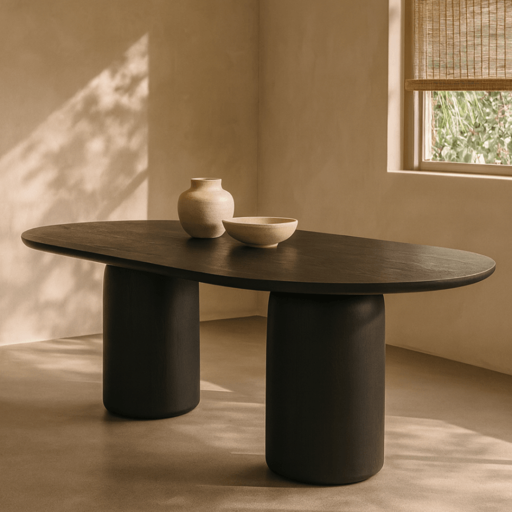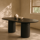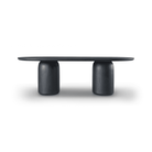 The Basilica Dining Table in Matte Black is a striking centrepiece for any dining space, with its bold capsule-shaped table-top and gently rounded edges. Supported by a twin pedestal base with a subtle 40mm radius, it combines stability with an open, airy feel. The spacious surface is perfect for family meals or entertaining, while the deep matte black finish adds a dramatic, modern elegance to the room.