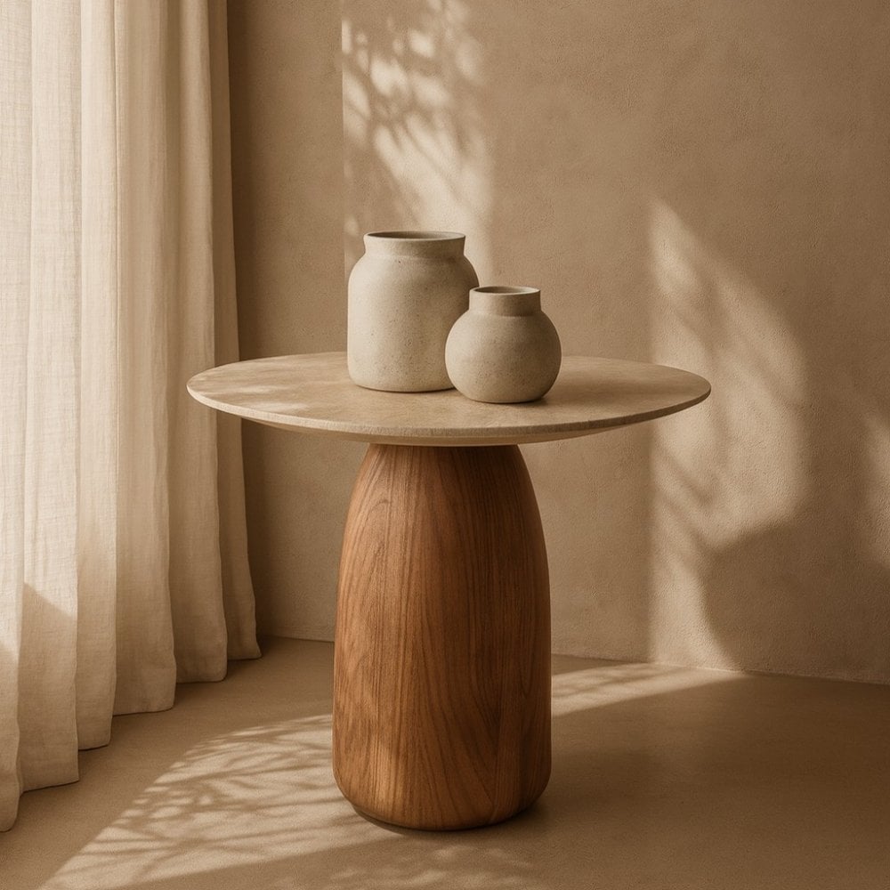 The Basilica Side Table in Walnut with a Matte Travertine Top blends natural warmth with refined sophistication. Its capsule-shaped silhouette and softly rounded edges create a smooth, sculptural form, while the rich walnut base adds depth and character. The matte travertine top introduces an elegant, organic contrast, offering a timeless finish that elevates any contemporary space. Perfect as an accent beside seating or as a standalone feature, it brings a harmonious balance of texture, tone, and modern design.