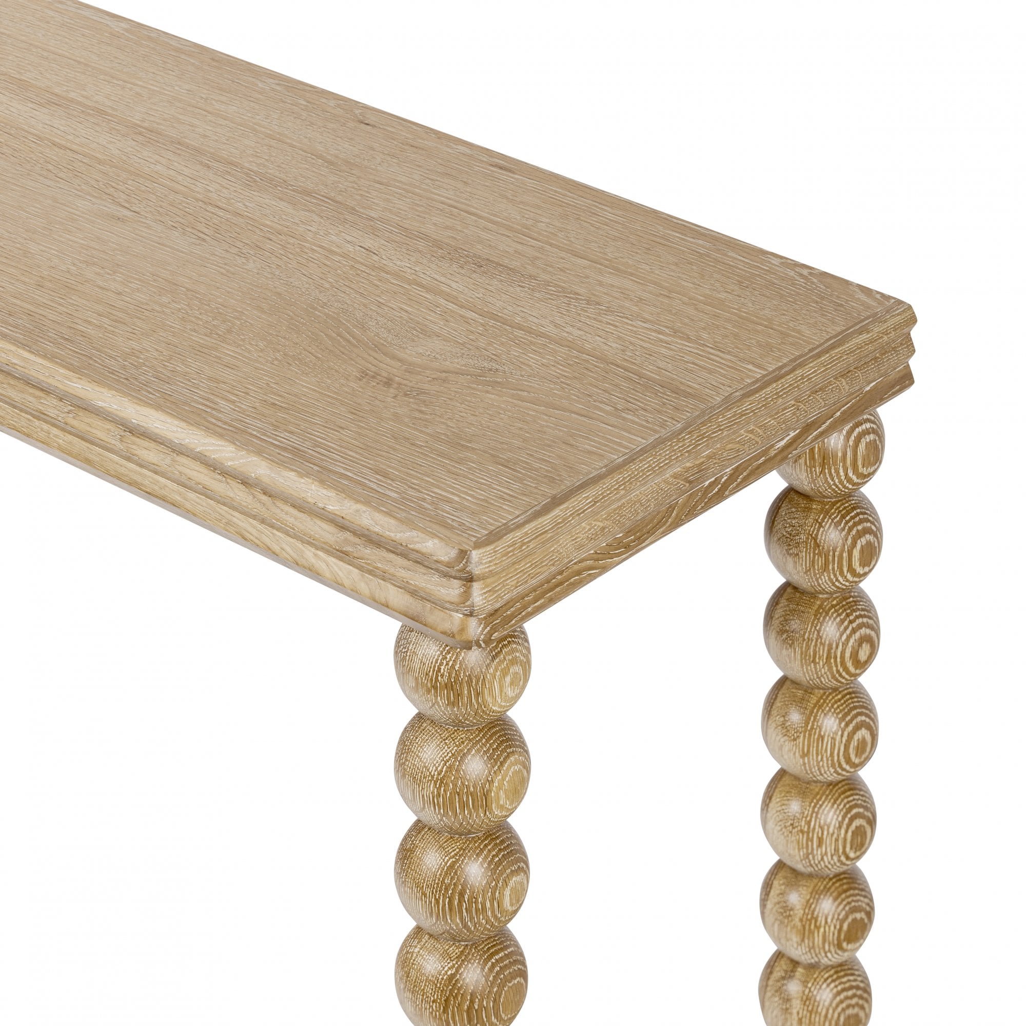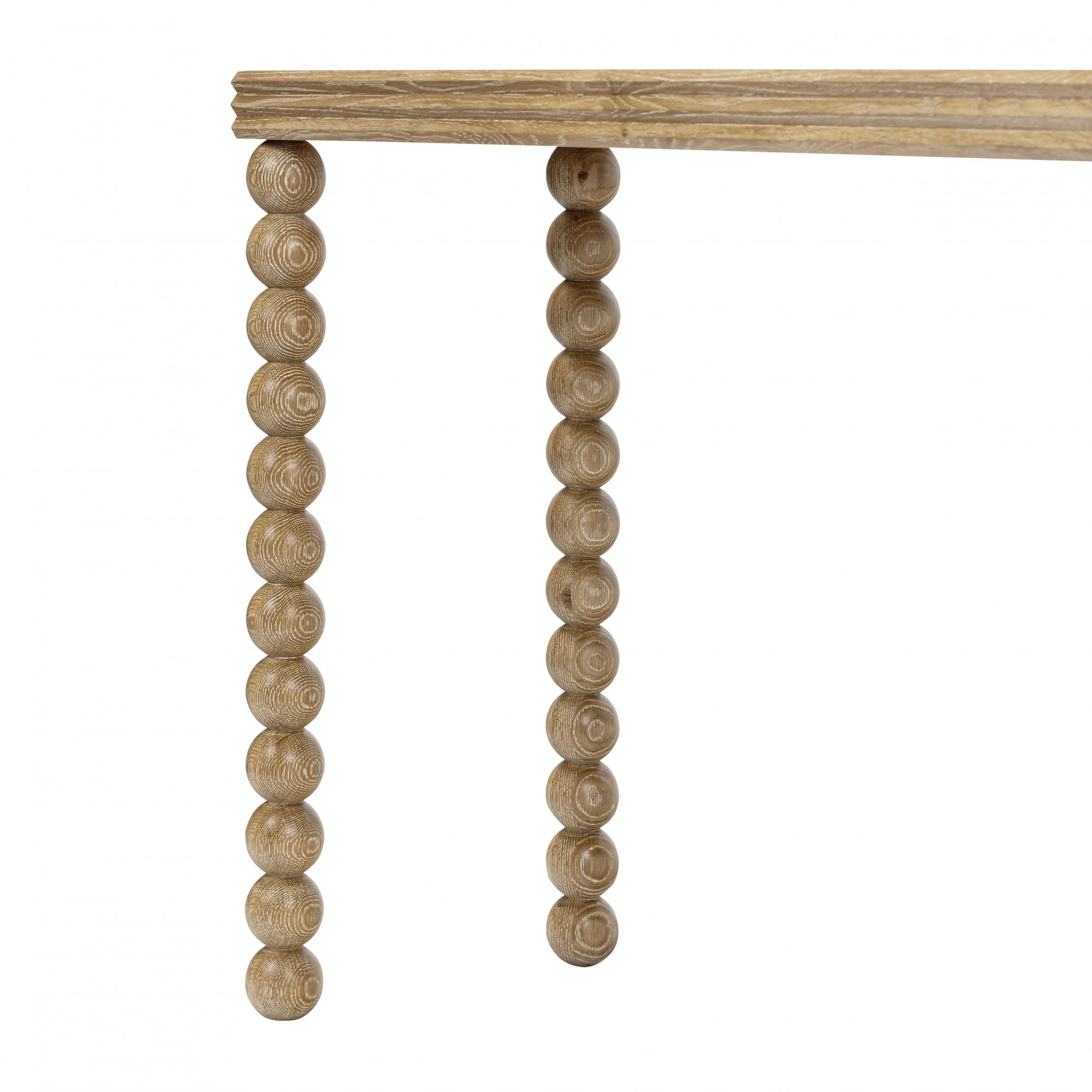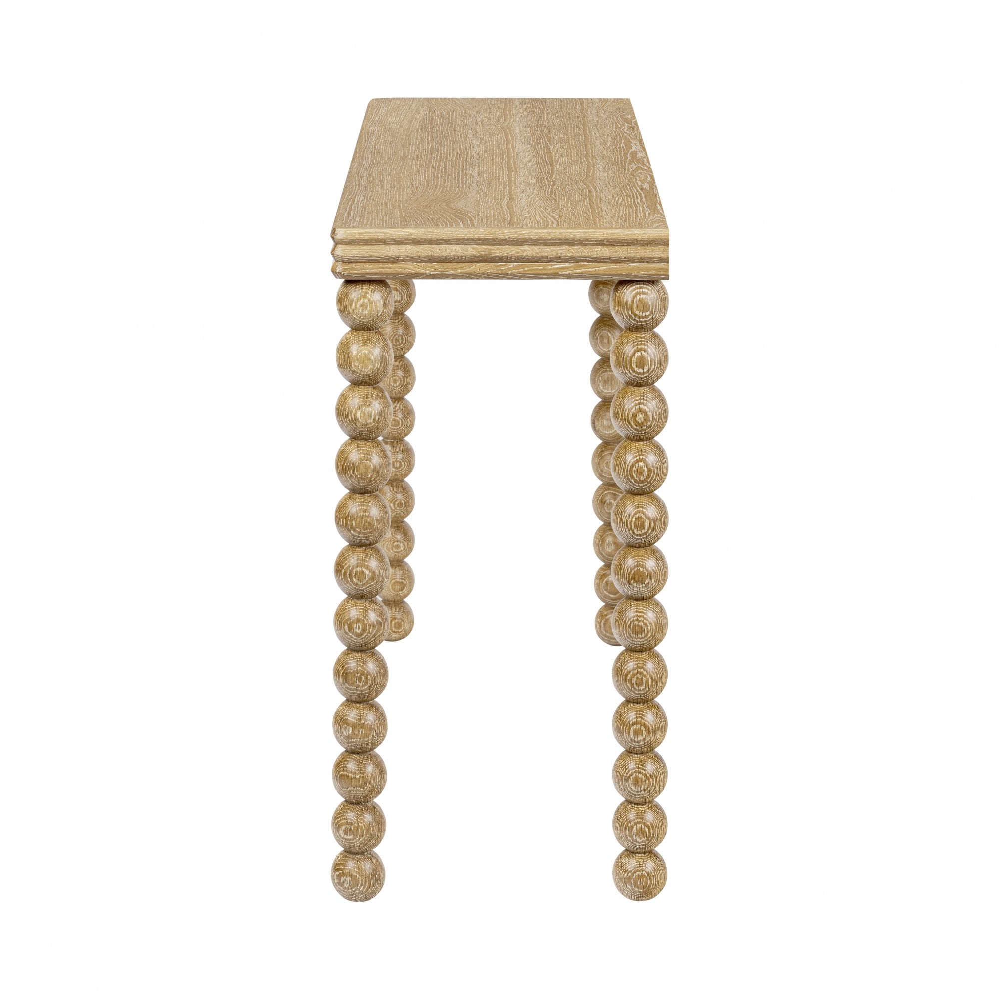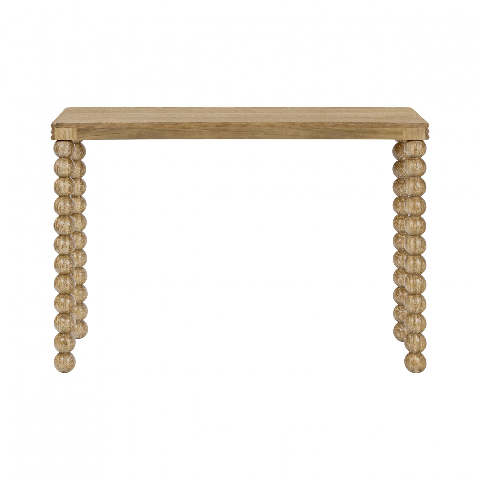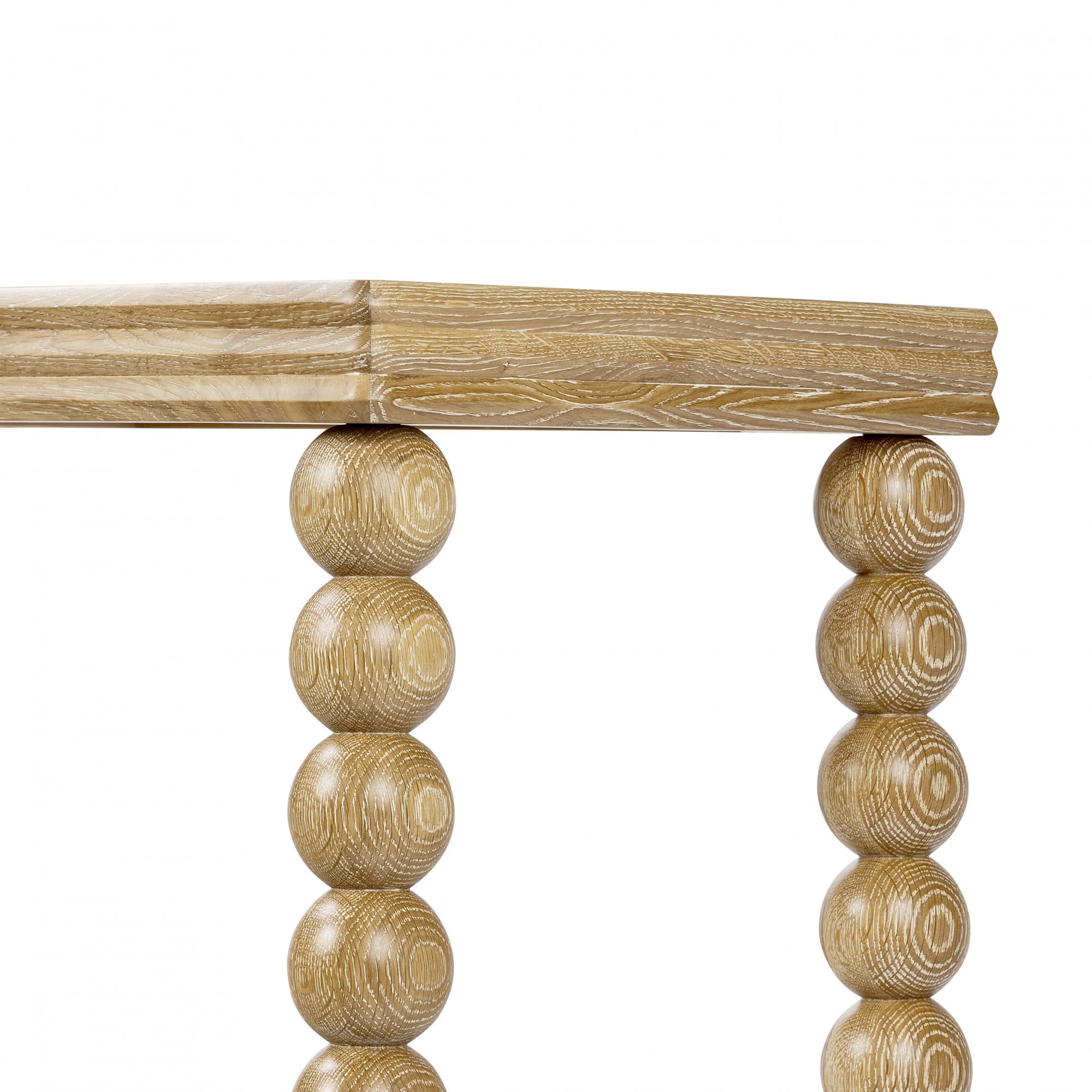 Bedwyn console table in oak. A fun, one-off piece in classic natural oak with a three-layered top and sphere design legs.