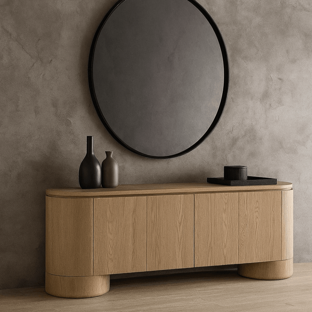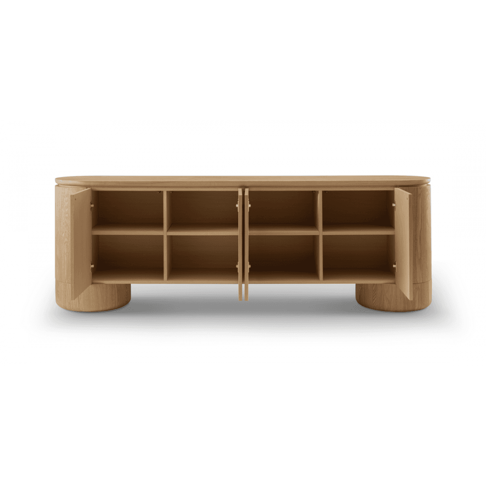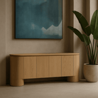 Minimal hardware keeps the look seamless and uncluttered, allowing the character of the wood to take centre stage. Whether viewed front-on or in profile, the piece speaks to symmetry and intention — a grounded, sculptural storage solution with serene impact. This is modern design at its most timeless: clean, tactile, and quietly luxurious. With its soft Scandi influences and architectural silhouette, the Berwick Buffet is a piece that brings calm elegance to interiors that value detail and restraint.