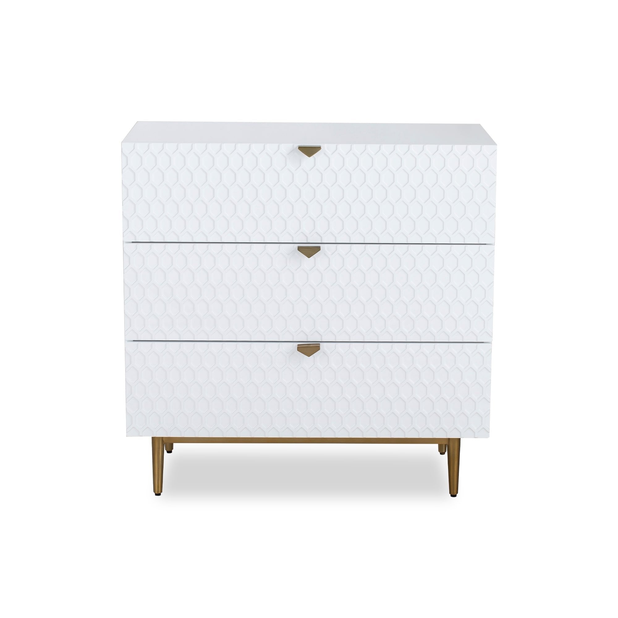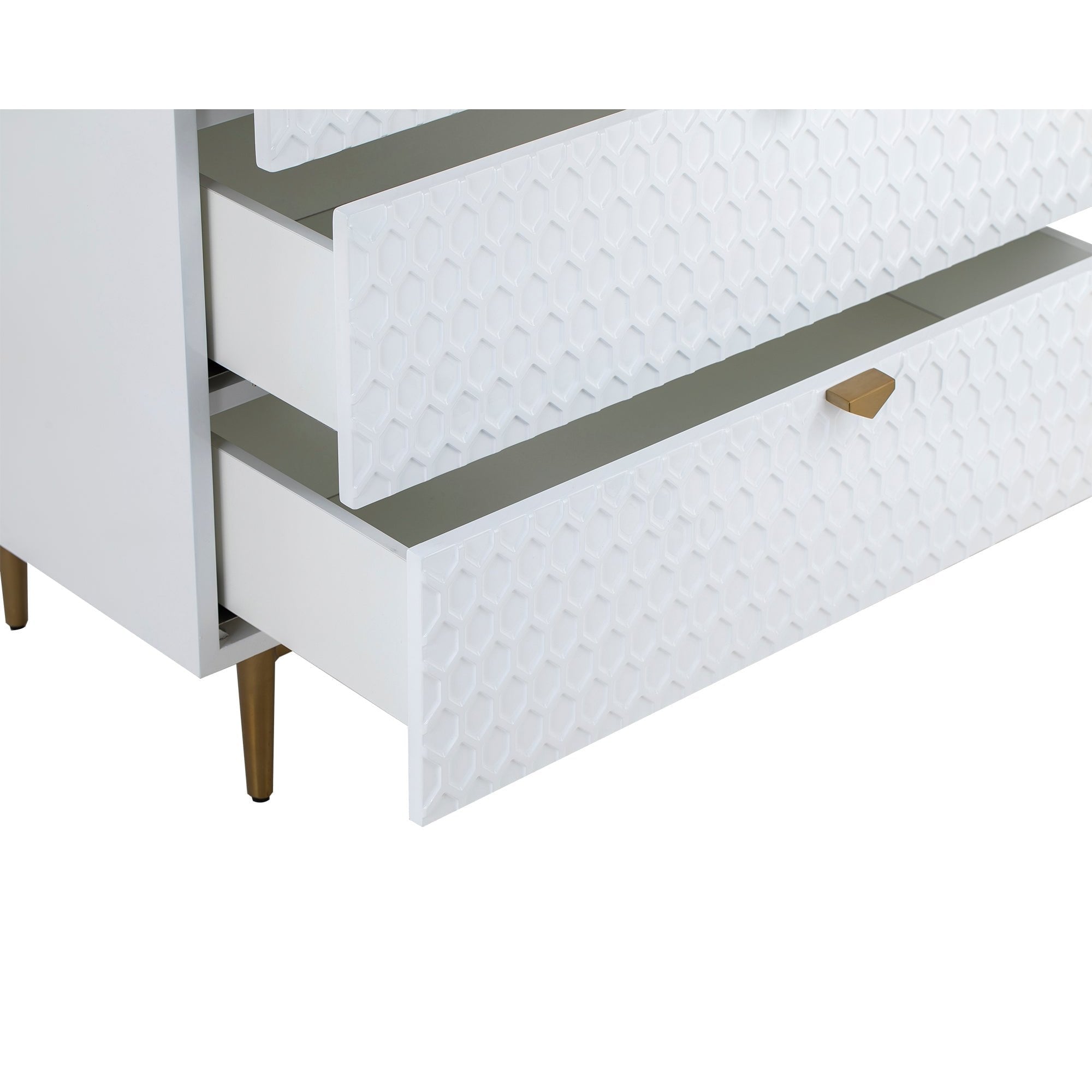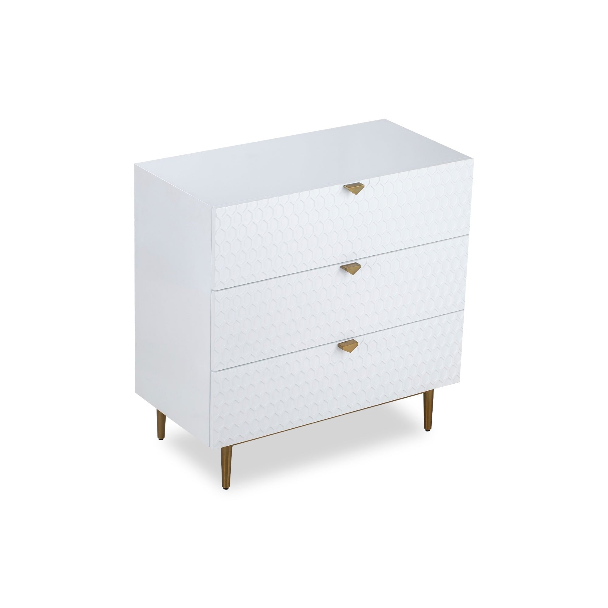 Introducing the Bolero Chest of Drawers, a statement piece that embodies modern luxury. Crafted with a high gloss white lacquer finish, it features a stainless steel brushed golden base and handles, adding elegance to any room. The striking hexagon pattern, enhanced by a 3D effect, captures attention, while three spacious drawers provide ample storage for your essentials.