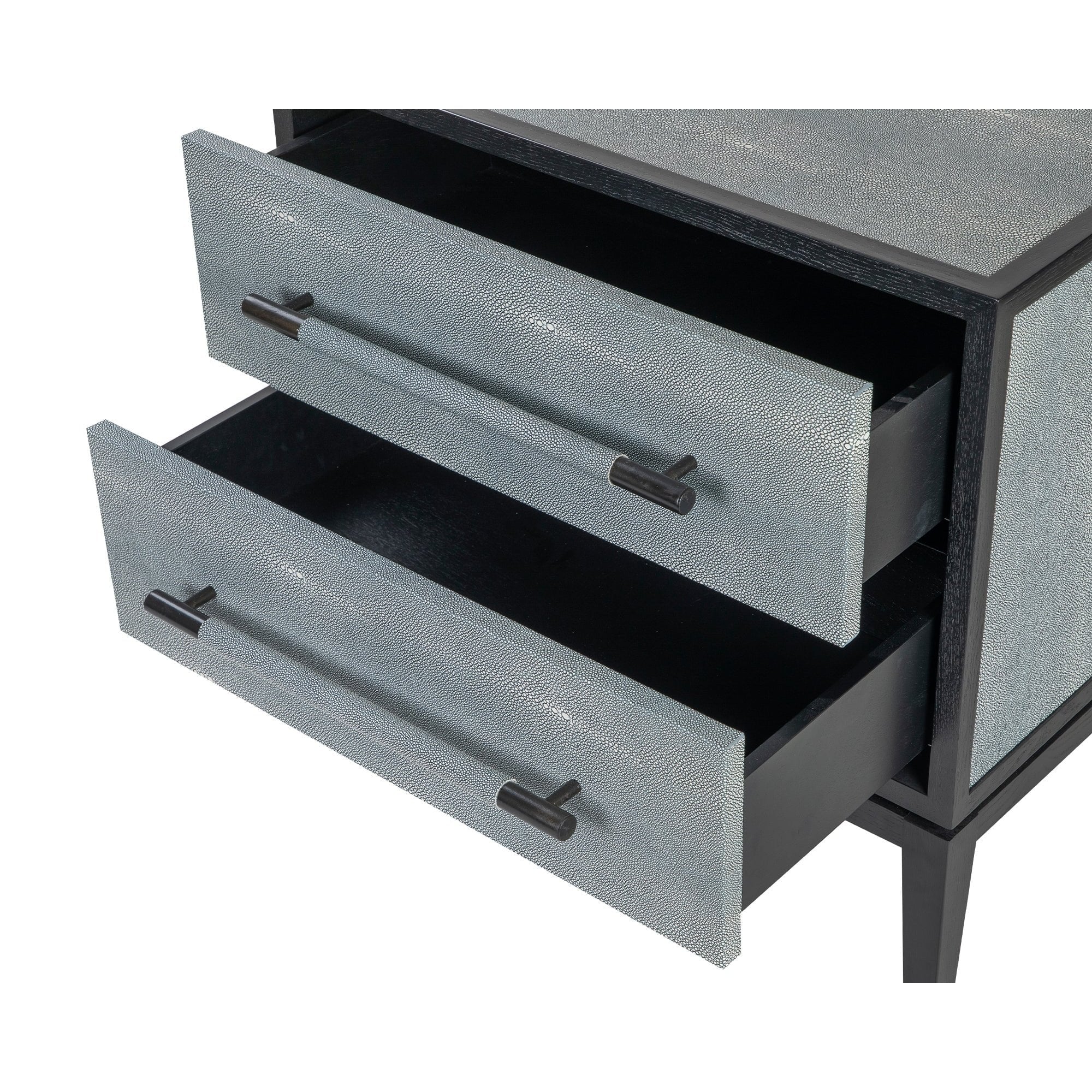 Transform your bedroom with the Bologna Bedside Table, designed to enhance any interior with its striking faux leather shagreen exterior in a sophisticated cool grey. This modern piece not only boasts stunning aesthetics but also offers practicality with its ample storage. The matching shagreen handles and a sturdy black ash veneer frame create a cohesive and stylish look that perfectly blends character and convenience.