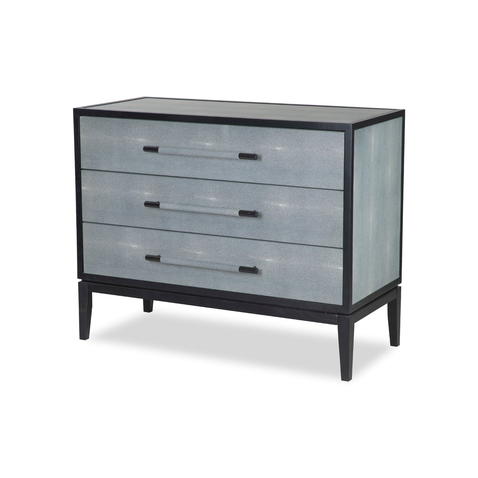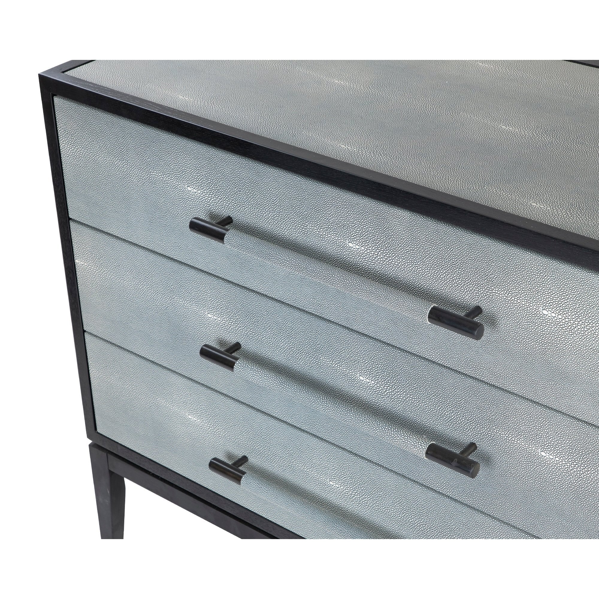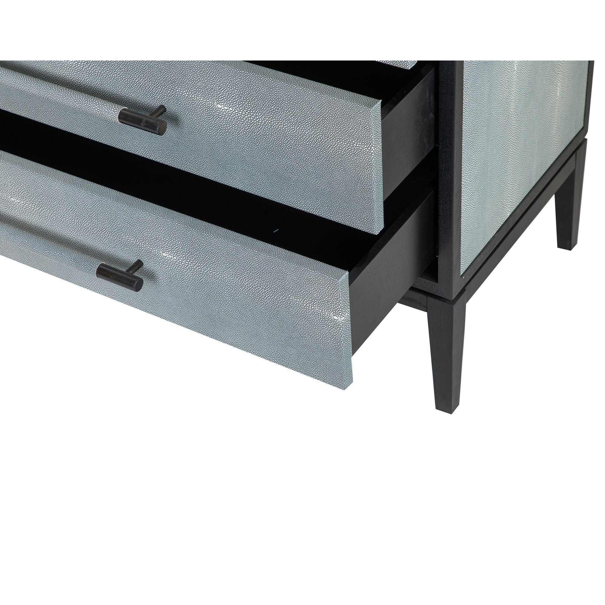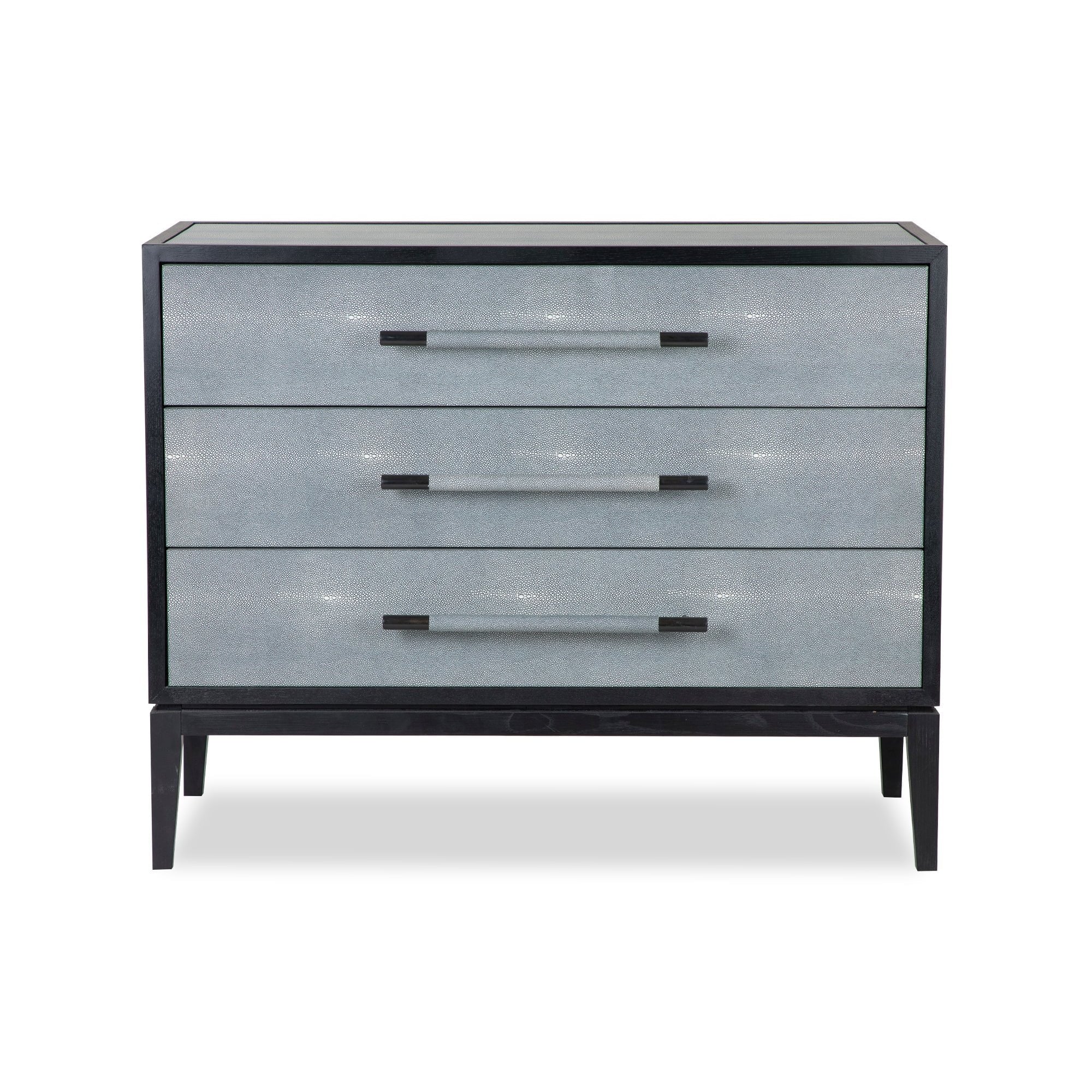 Transform your bedroom with the Bologna Chest of Drawers, where modern design meets practicality. Its stunning faux shagreen exterior in a cool grey tone offers a chic appearance that elevates any interior space. Featuring sleek black ash veneer and matching shagreen handles, this chest combines exquisite style and convenience, making it a must-have.