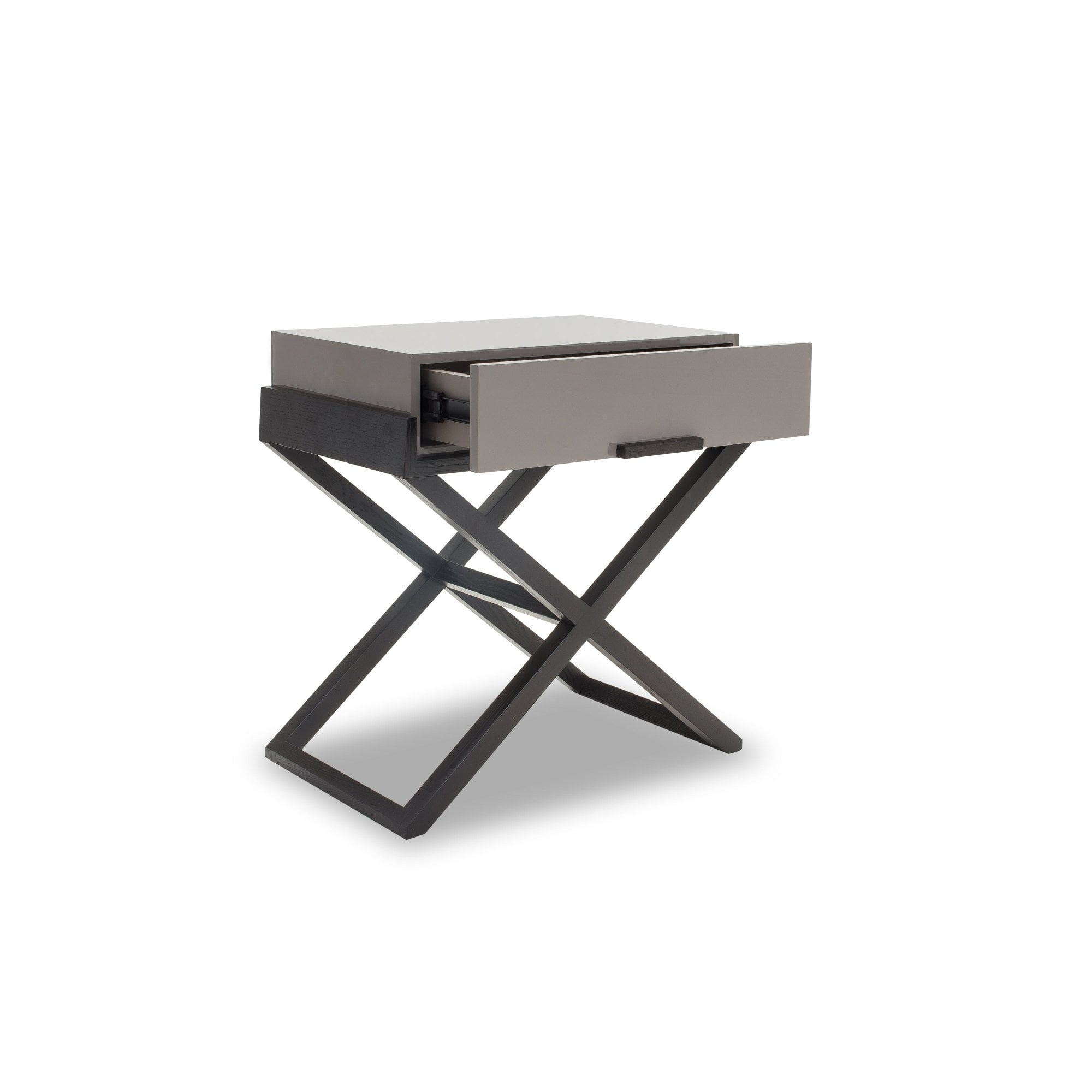 Transform your bedroom with the Boston Bedside Table, an elegant fusion of Oriental and contemporary design. Featuring a taupe-grey high gloss lacquered wood top and a solid wood base in rich wenge, this slim table serves as a stylish nightstand or side table. It includes a convenient frieze drawer for storage, blending beauty with functionality.