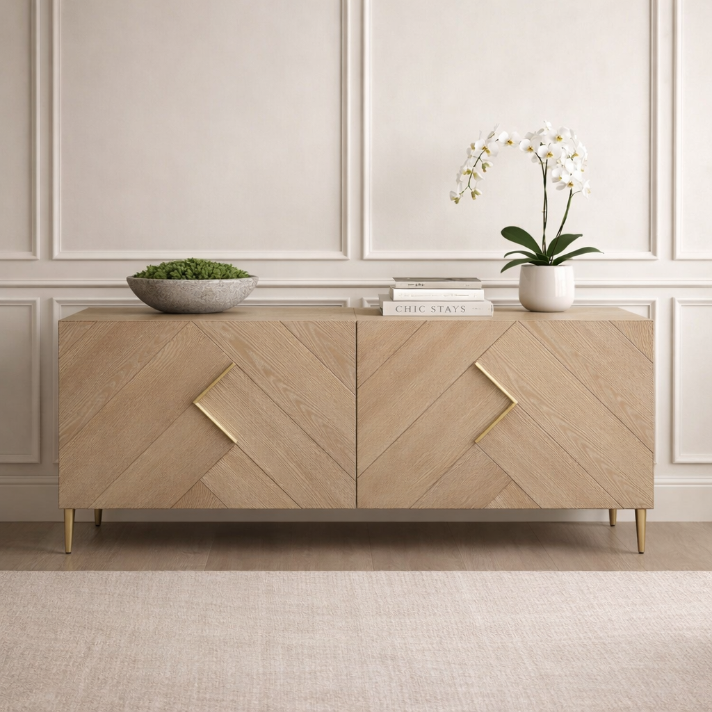 Burford Sideboard in Textured Natural Oak Wood with Brass Handles & Legs 2 Doors