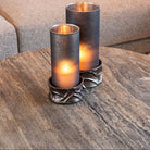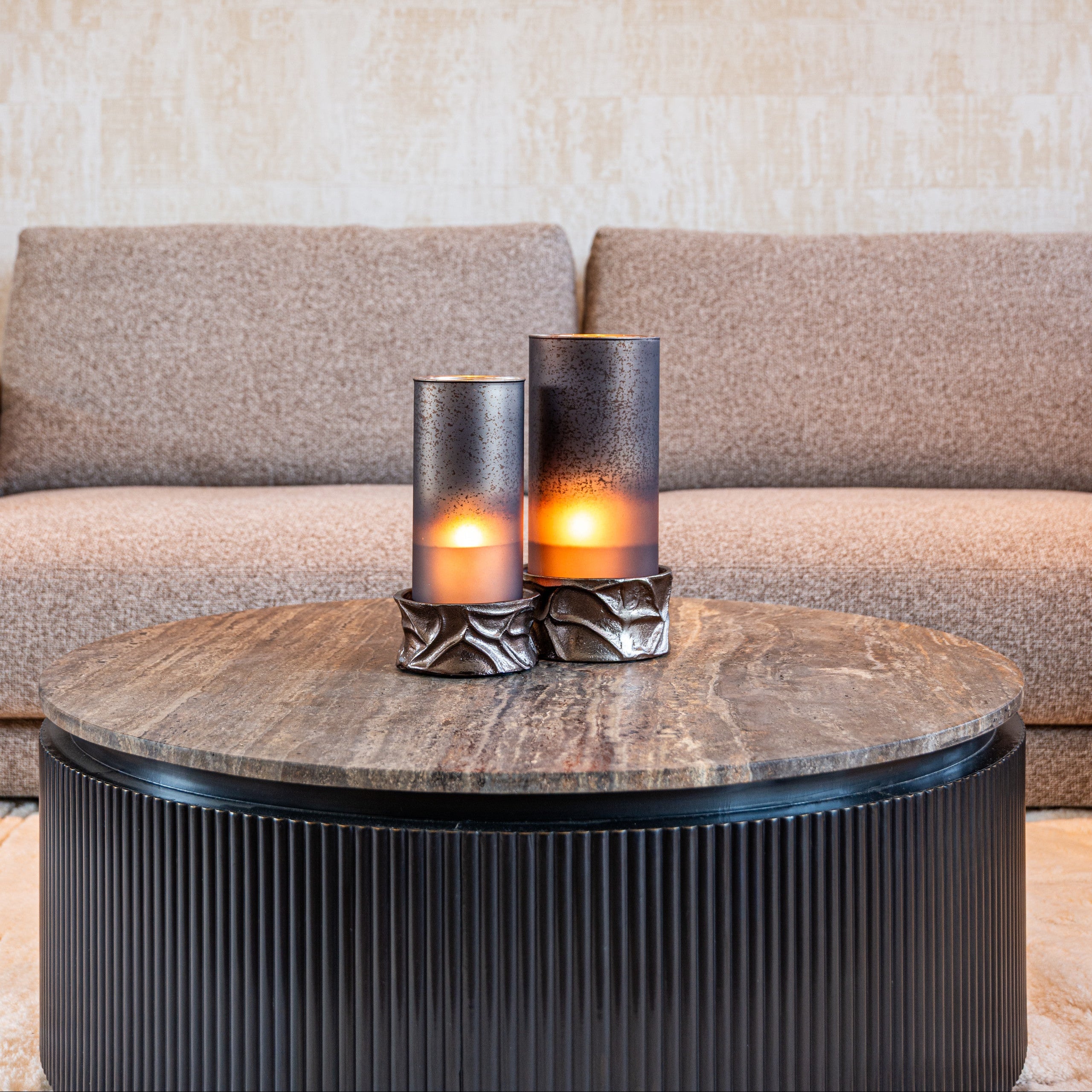 The Russo collection is manufactured in India using a metal cladding technique, in which a thin layer of metal is shaped by hand and attached to a wooden base. The design is similar to the Ironville but features a dark brown bronze metal finish. The tabletop is made of brown travertine, also known as titanium travertine, which gives the collection a warm and distinctive look.