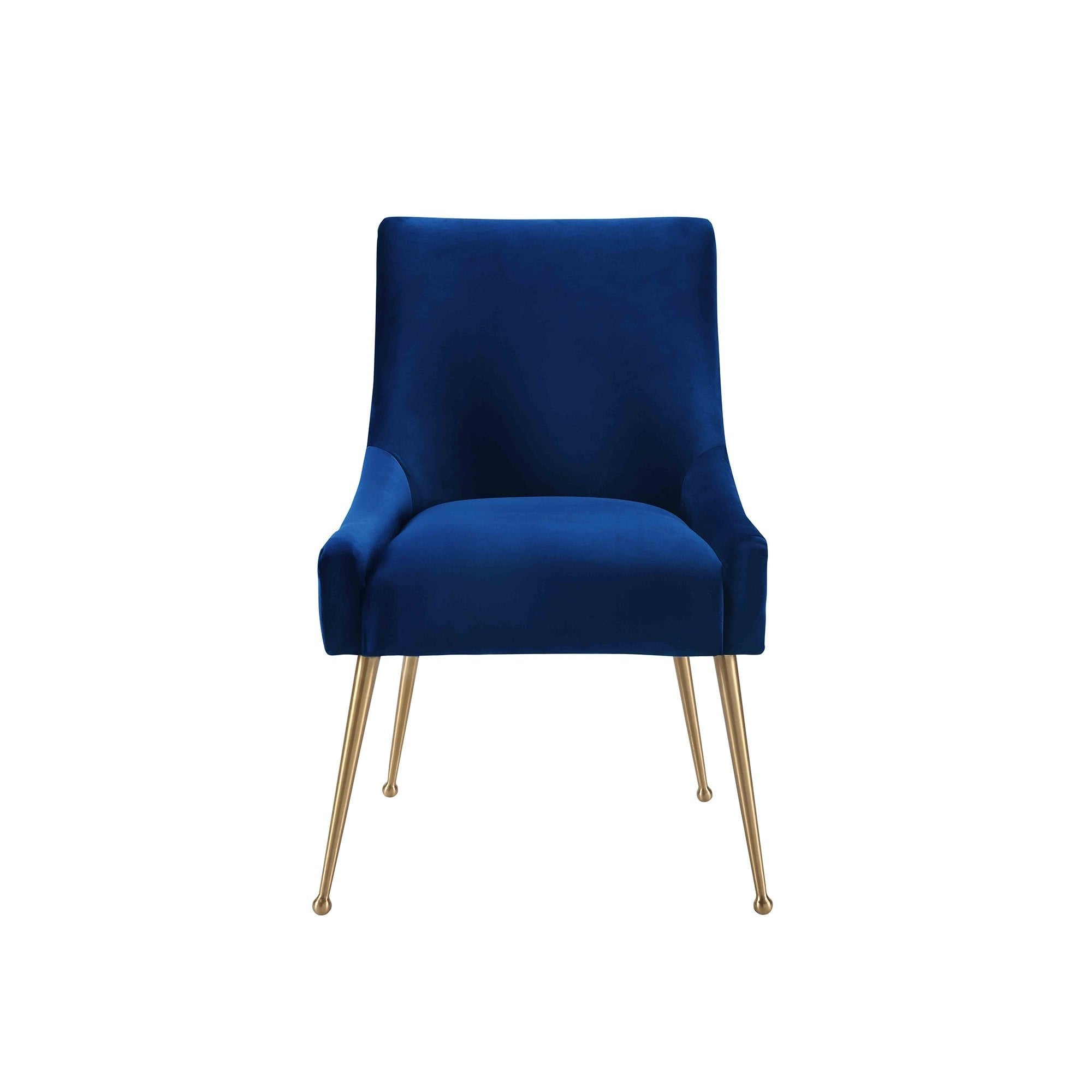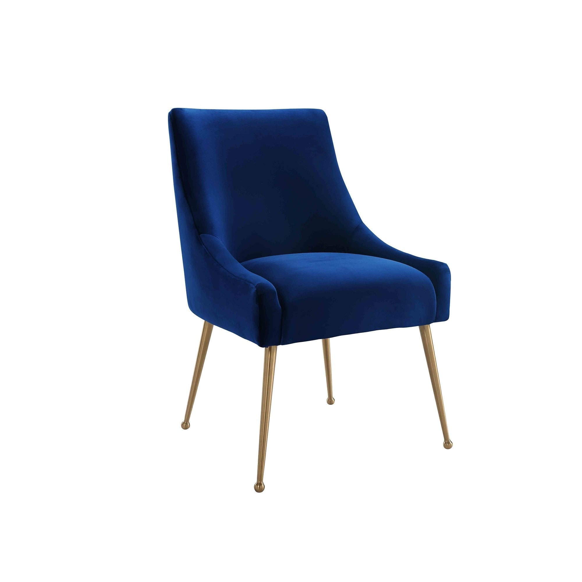 Introducing the Cohen Dining Chair, upholstered in luxurious marine blue velvet fabric that exudes elegance and comfort. The chair features tapered brass legs and a stylish handle on the backrest, adding both practicality and a chic accent. Available in a variety of colors, this versatile piece enhances any dining space with its sumptuous allure. (Legs require installation.)