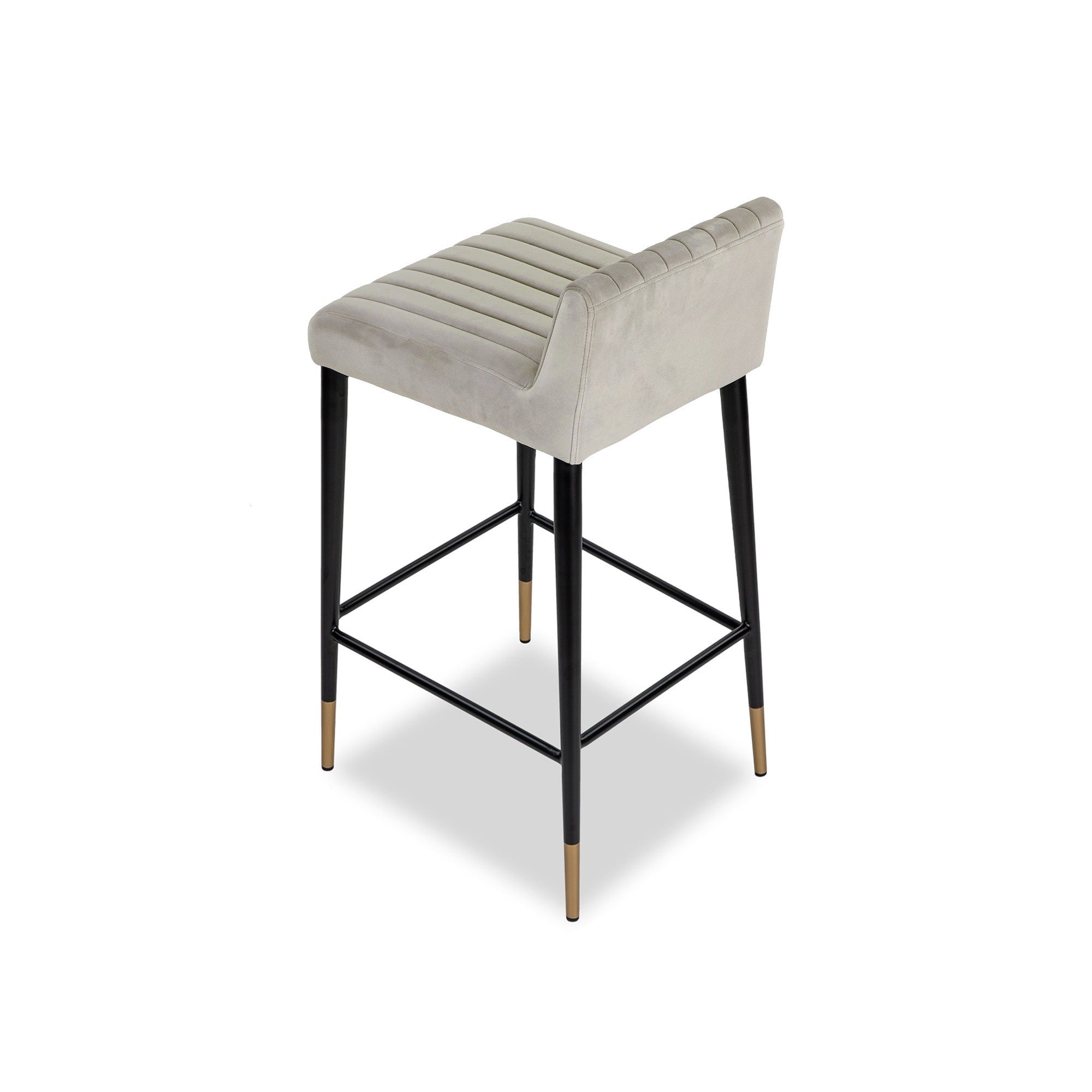 Make a striking impression with the Liang & Eimil Coltrane Counter Stool, designed to stand out in any space. Upholstered in luxurious Recycled Megan Light Grey Velvet, it offers a soft, supportive seat for ultimate comfort. The modern channel stitching, sleek lines, and tapered matt black steel legs with elegant gold feet create a chic, durable addition to your bar or counter area.