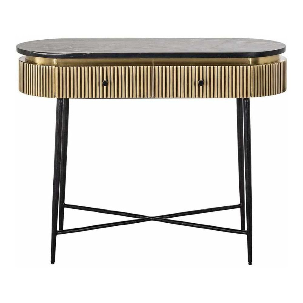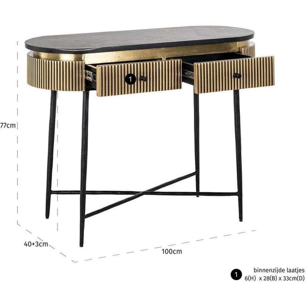 This sleek console table features slim black legs, The top is crafted with a rounded wooden edge in a brass finish and topped with a slim black marble and two small handles.