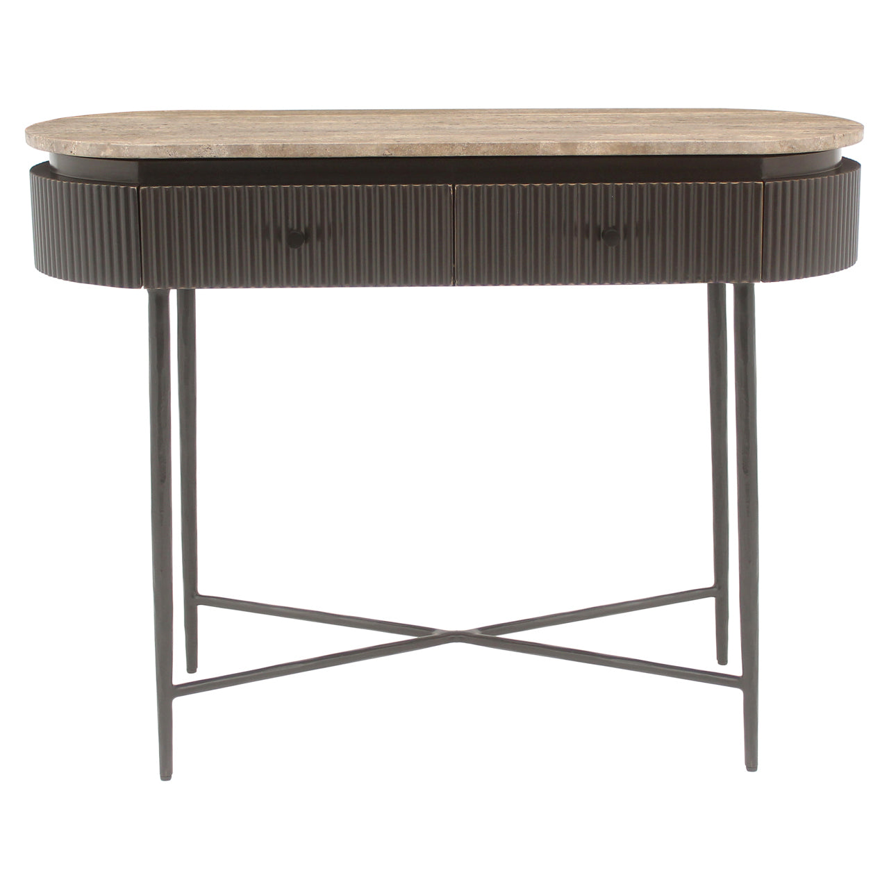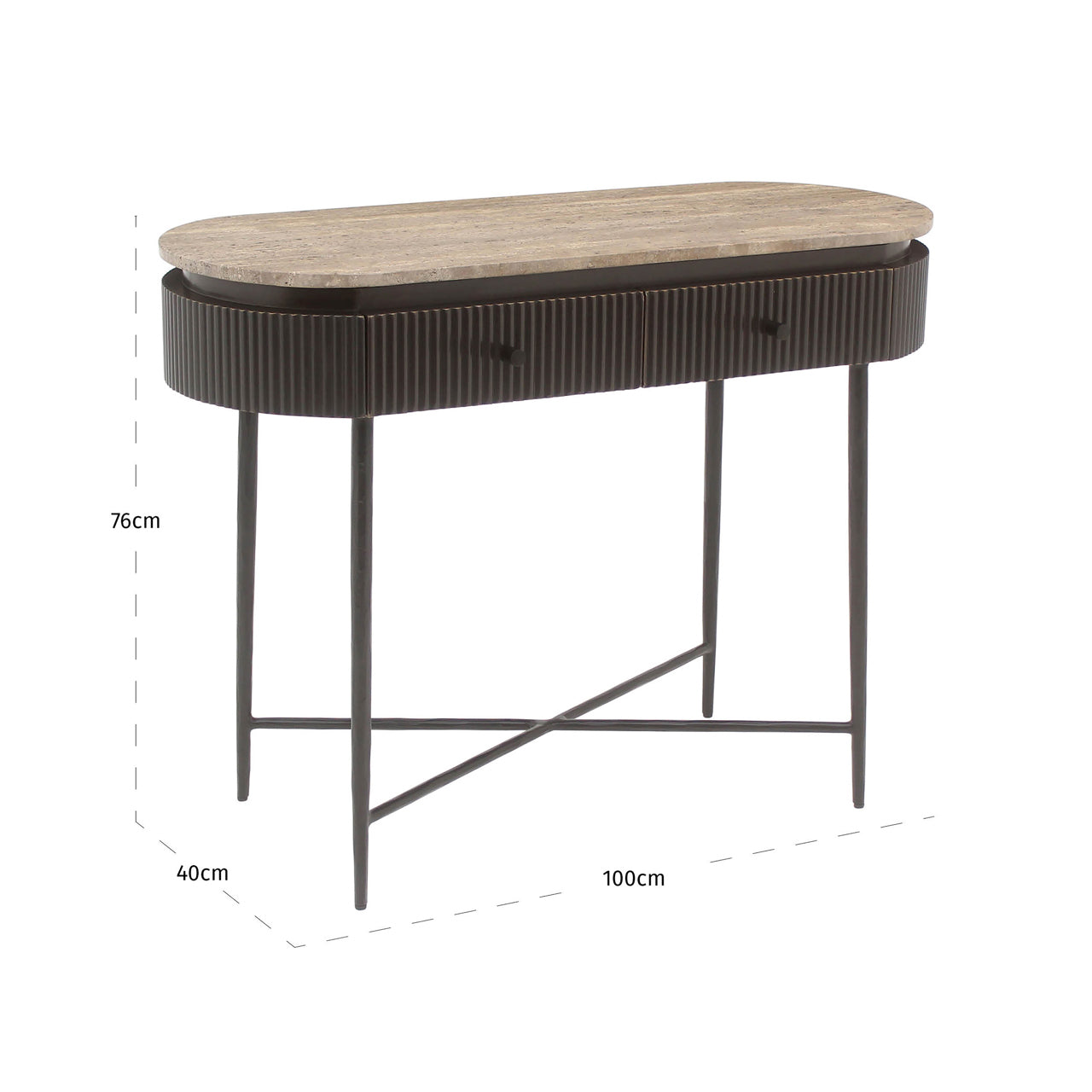 The Russo collection is manufactured in India using a metal cladding technique, in which a thin layer of metal is shaped by hand and attached to a wooden base. The design is similar to the Ironville but features a dark brown bronze metal finish. The tabletop is made of brown travertine, also known as titanium travertine, which gives the collection a warm and distinctive look.