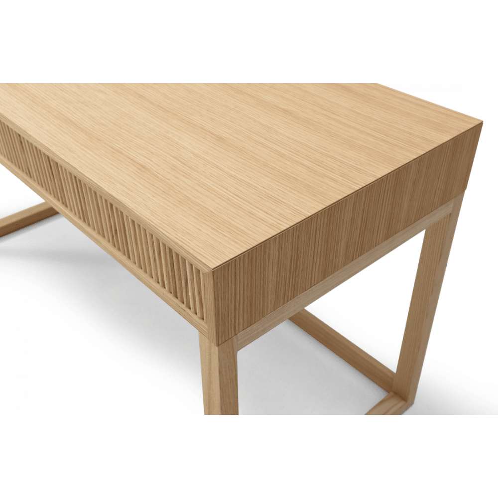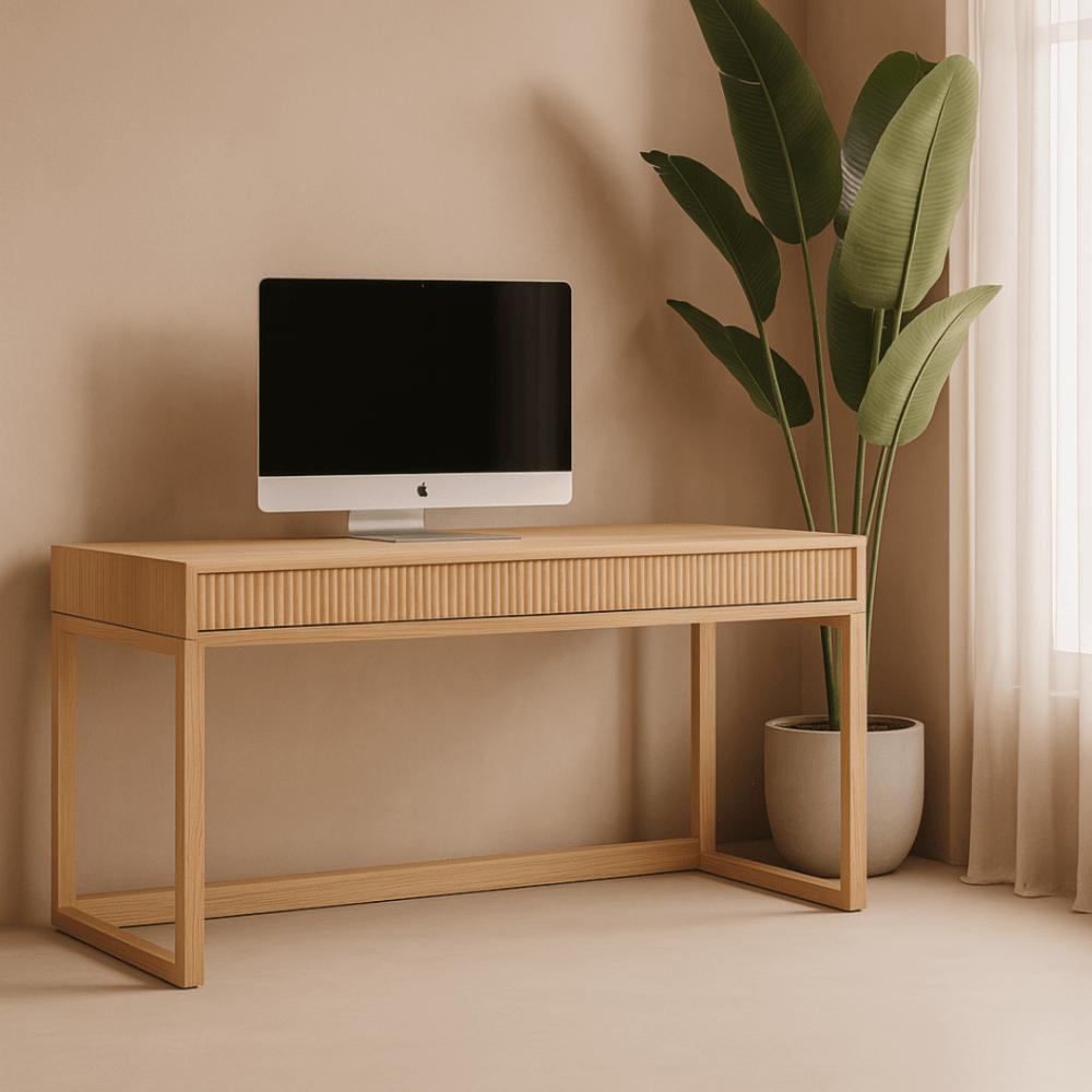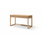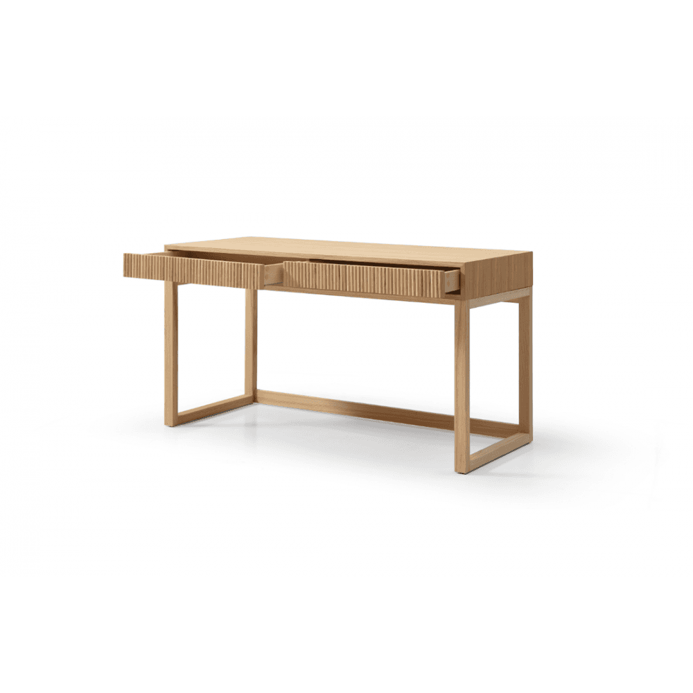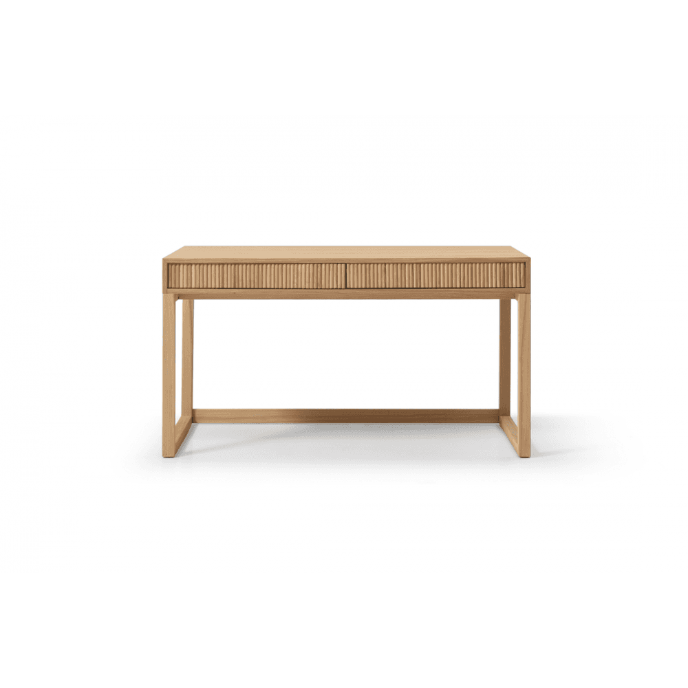 The Costine Desk is a contemporary piece that artfully blends Scandi influences with a coastal, relaxed vibe, making it a stylish addition to any home office or study. Its ash oak veneer finish imparts a natural and light feel, while the ribbed front detailing adds a touch of texture and sophistication. The desk features two generous-sized drawers, providing ample storage for office essentials, and its 1.4m width and 60cm depth offer a spacious work surface. This combination of functional design and aesthetic appeal ensures the Costine Desk is both practical and visually pleasing, perfect for creating a serene and productive workspace.