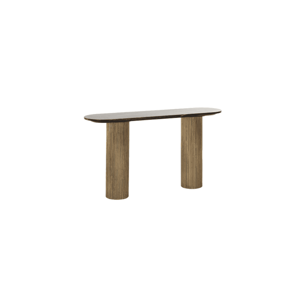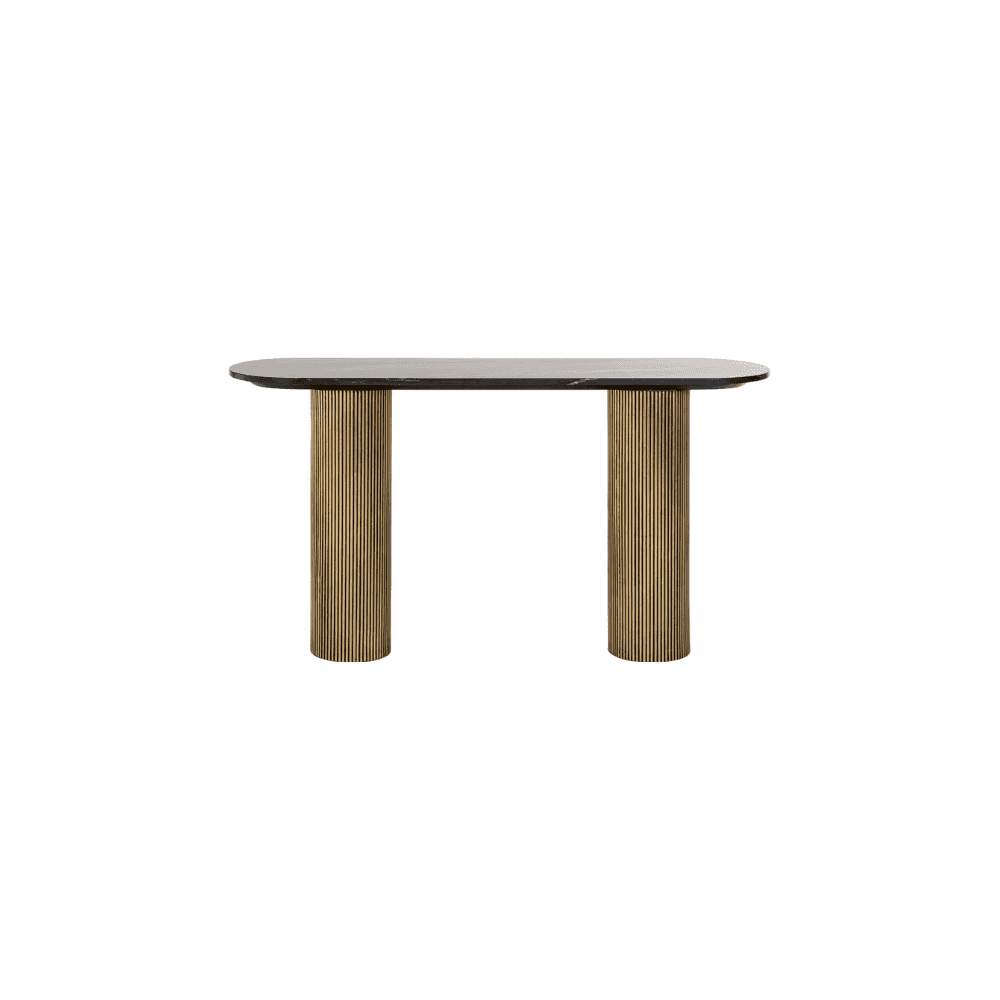Supported by two tall, cylindrical legs, the table ensures stability and strength, while their ribbed brass detailing infuses a warm, golden glow that complements any décor. The sleek, pill-shaped black surface is ideal for holding essentials like keys and wallets, or displaying decorative items.