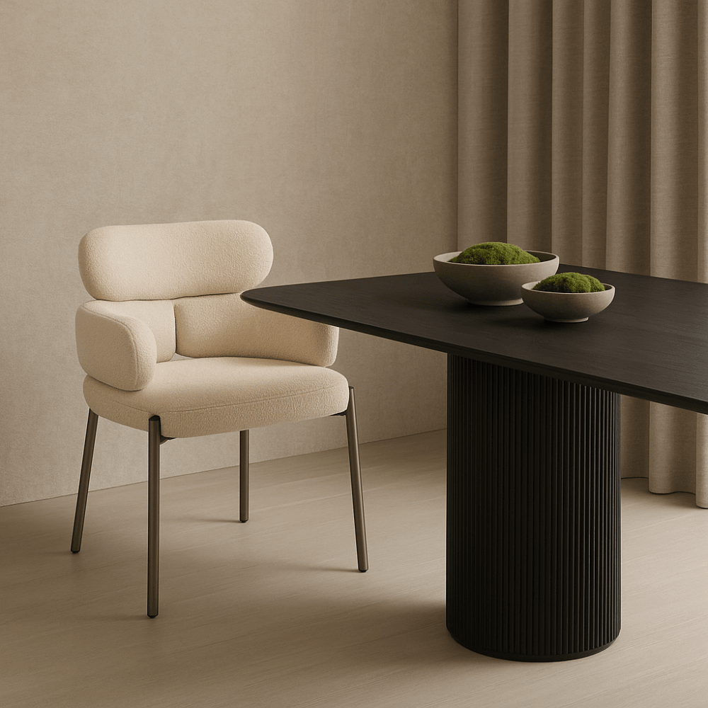 In Flora Taupe, the Dream Dining Chair embodies contemporary elegance with a fresh, sophisticated design. Wrapped in luxurious bouclé fabric, the chair provides soft, comfortable seating that invites relaxation. Its matte gunmetal legs offer a modern contrast, adding to its sleek and stylish silhouette. Ideal for upscale dining spaces, the Dream Dining Chair seamlessly integrates style and practicality, making it the perfect choice for those desiring a chic and polished dining experience.