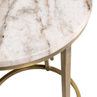 The Bottega collection is crafted from Toronto marble, a type of marble quarried locally in India, combined with steel bases featuring an antique brass finish. The warm brass finish, paired with the marble, creates a rich and inviting look.