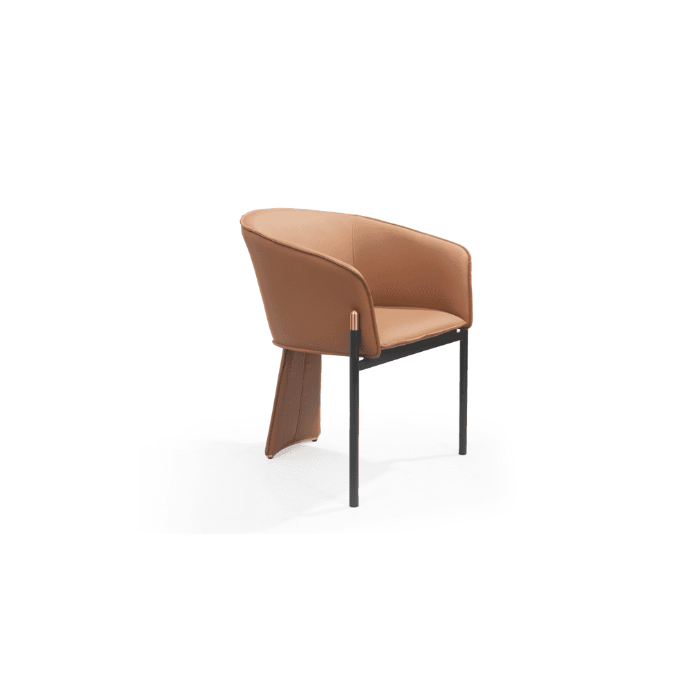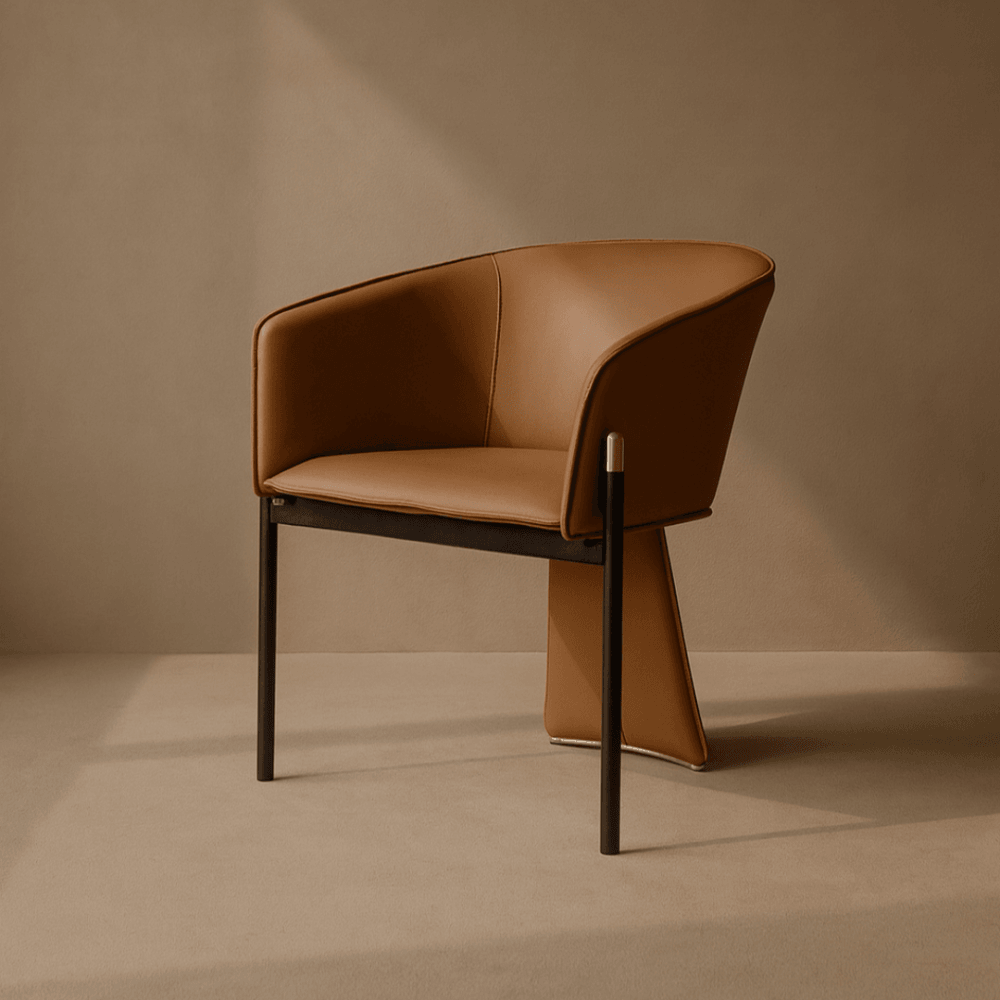 The Felipo Dining Chair is a true embodiment of unique design, making a striking statement in any dining setting. Its intriguing form, supported by three distinctive legs, immediately captures attention and sparks curiosity. The tan faux leather upholstery not only adds a touch of luxury but also offers comfort during meals.
