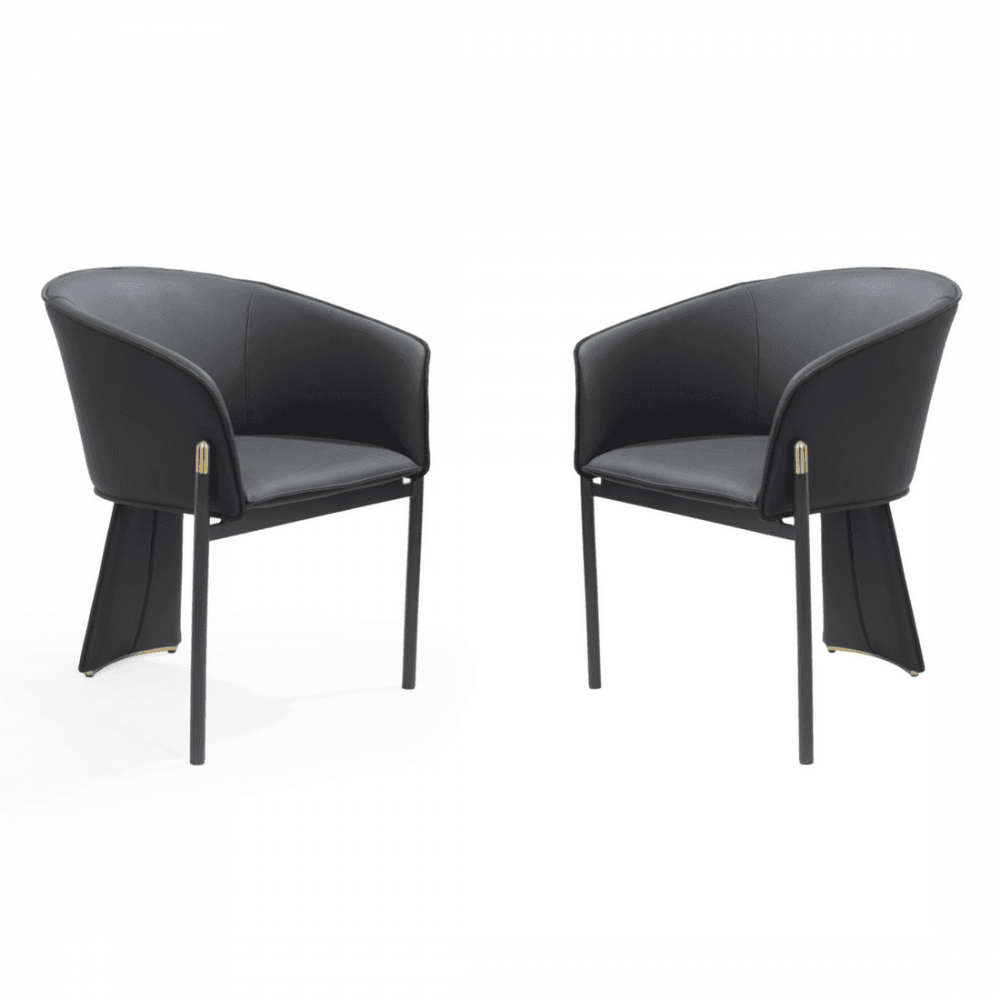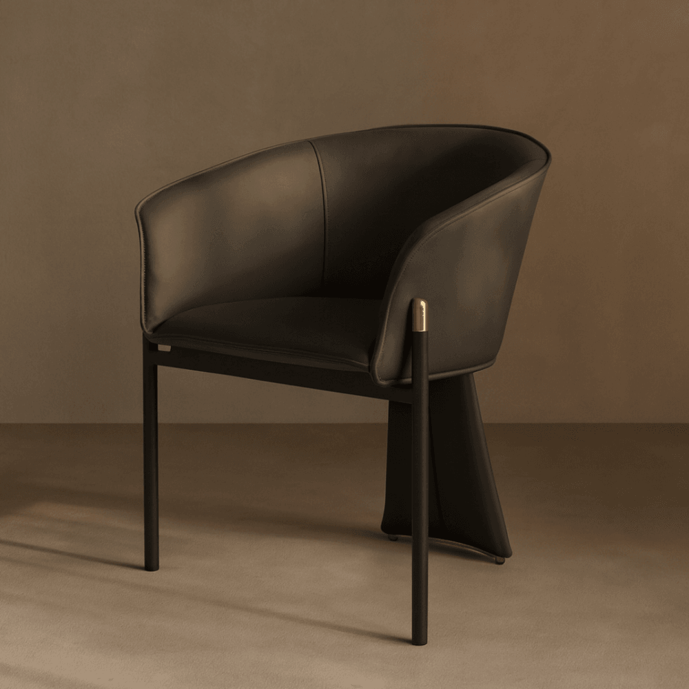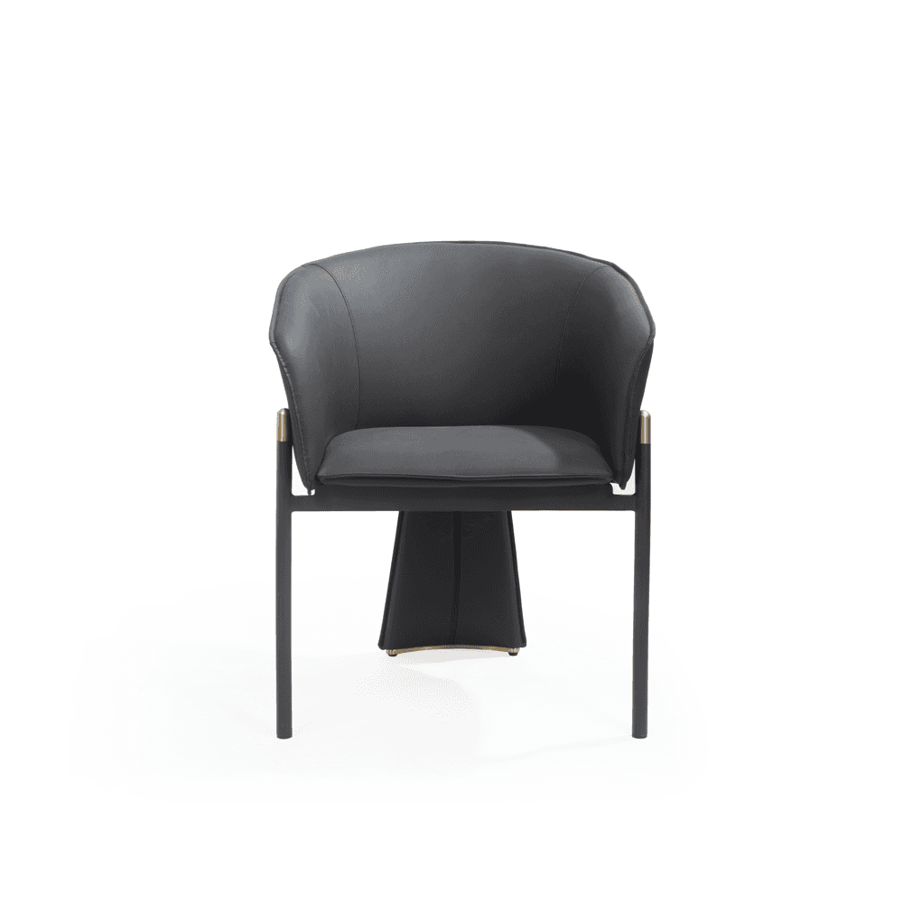 The Felipo Dining Chair is a bold statement of contemporary design, seamlessly blending artistic form with luxurious comfort. Its distinctive three-leg silhouette creates an eye-catching focal point, elevating any dining space with a touch of modern sophistication. Upholstered in sumptuously smooth Mustang Black faux leather, this chair exudes elegance while offering exceptional comfort for refined dining experiences. The sleek black powder-coated frame enhances its contemporary appeal, while gold capping details add a subtle hint of opulence. More than just a dining chair, the Felipo is a conversation piece—perfect for those who appreciate striking aesthetics and elevated craftsmanship.