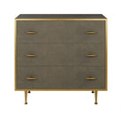 Three drawer grey Hampton chest of drawers in faux shagreen. Featuring antique brass style handles and legs, drawers on metal runners and walnut style wood on inside of drawers, Please note handles and base need assembly.