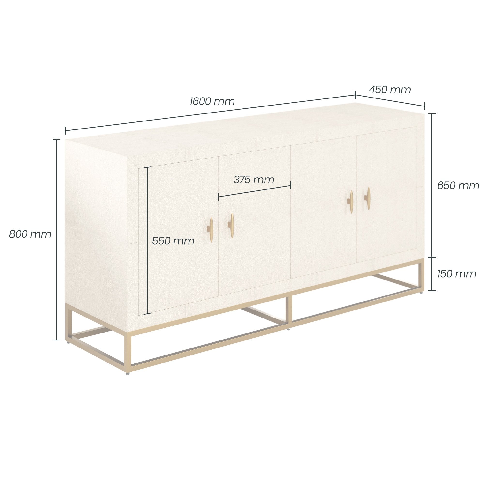 Hampton four door ivory sideboard in faux shagreen ivory wood. Featuring antique brass handles, antique brass base and internal shelving.
