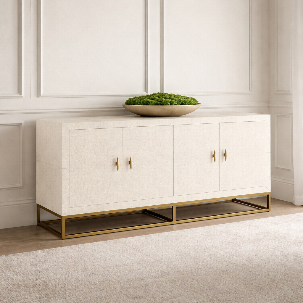 Hampton Faux Shagreen Ivory Wood Sideboard with Antique Brass Handles & Legs