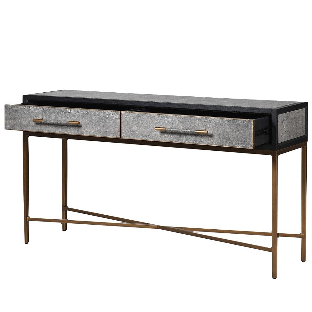 Islington Console Table Grey Oak Wood & Shagreen with Brass Legs & Handles 2 Drawer