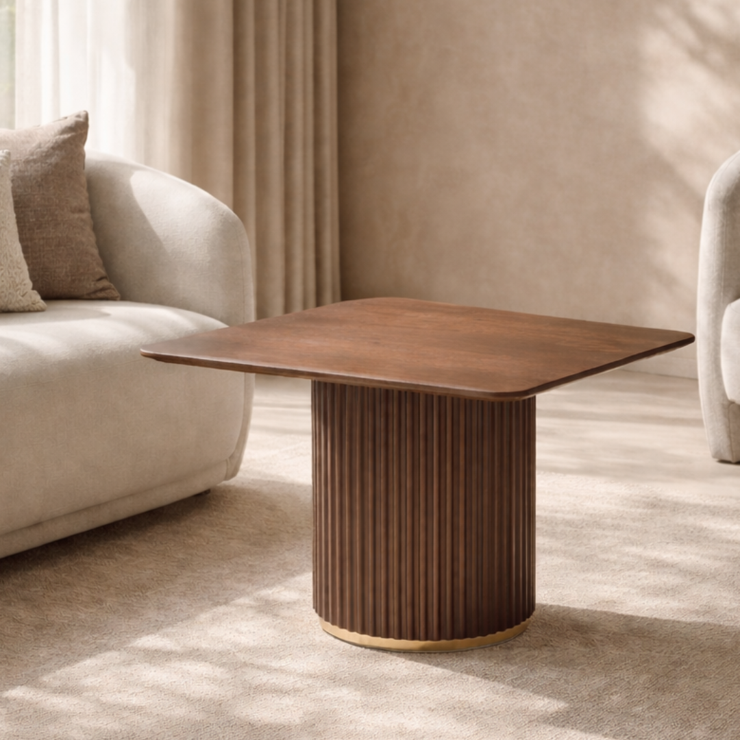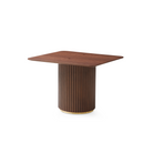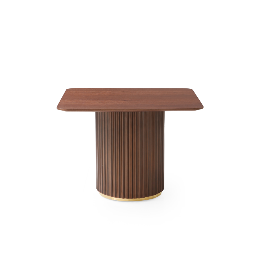 The Lantine Side Table combines natural elegance with contemporary sophistication. Featuring a walnut veneer top, its rich tones create an inviting warmth, while the ribbed walnut lacquer base adds texture and depth. Delicate brass accents elevate the design, providing a touch of refined luxury. The Lantine Side Table is a stylish yet practical addition to any living space, effortlessly blending form and function.