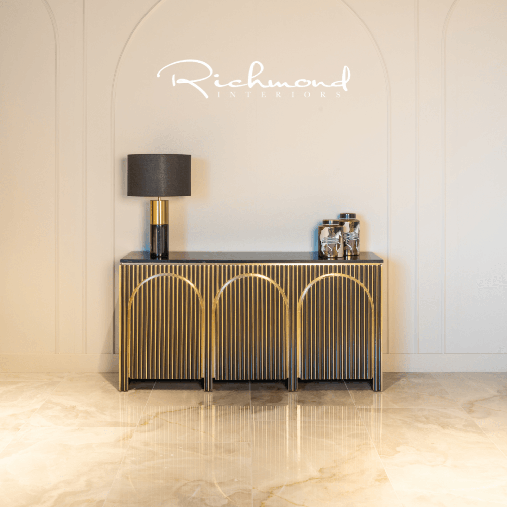 The Les Arcs 3-Door Brushed Gold Sideboard from Richmond Interiors is a stunning blend of style and functionality. Crafted from brass, marble, and MDF, it boasts a luxurious brushed gold finish that adds a touch of elegance to any space. The three doors open to reveal ample storage, perfect for keeping your essentials organized and out of sight. Topped with sleek marble, this sideboard is both a practical storage solution and a striking statement piece for your dining or living area.