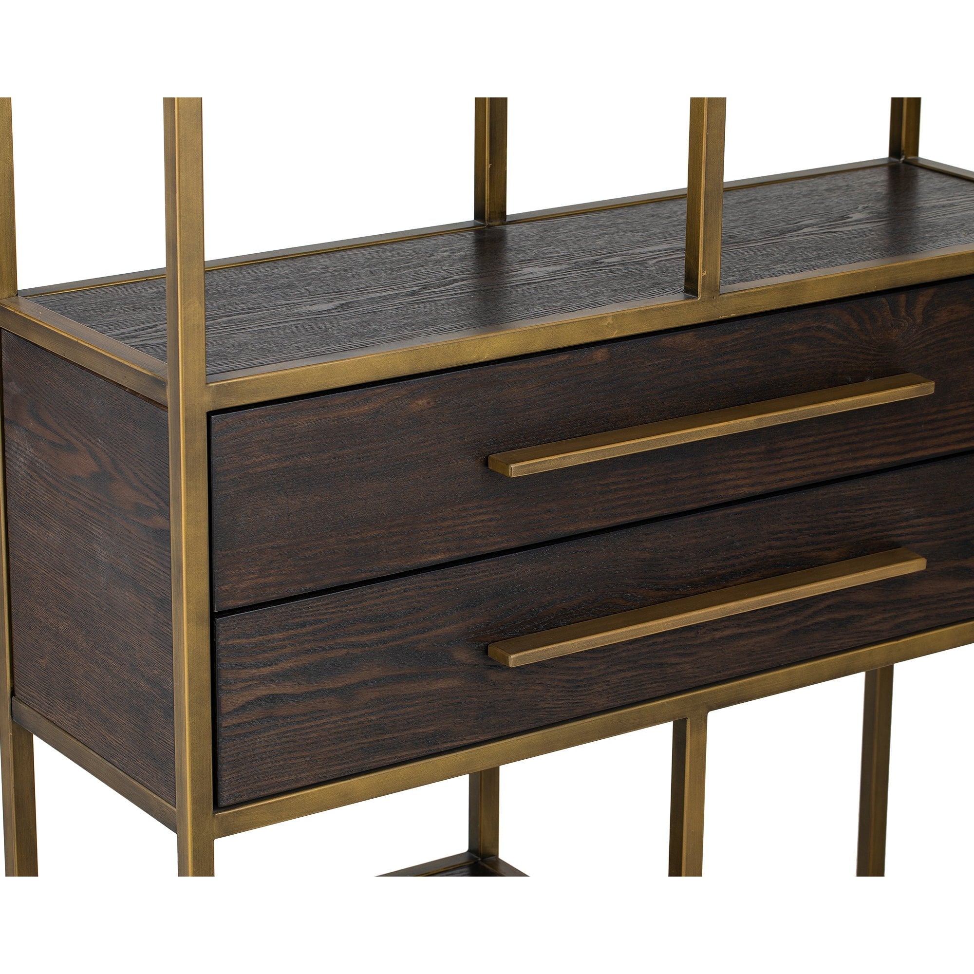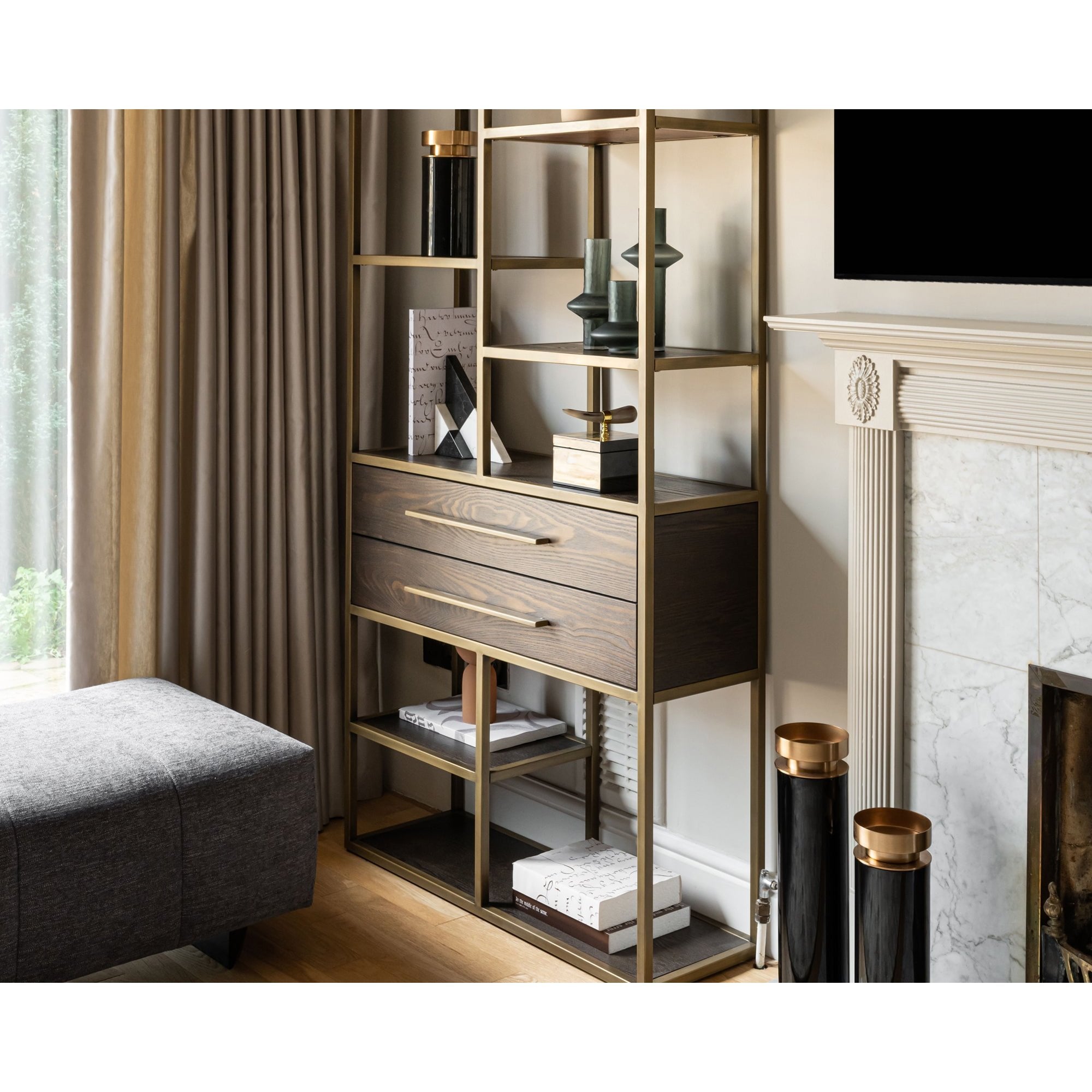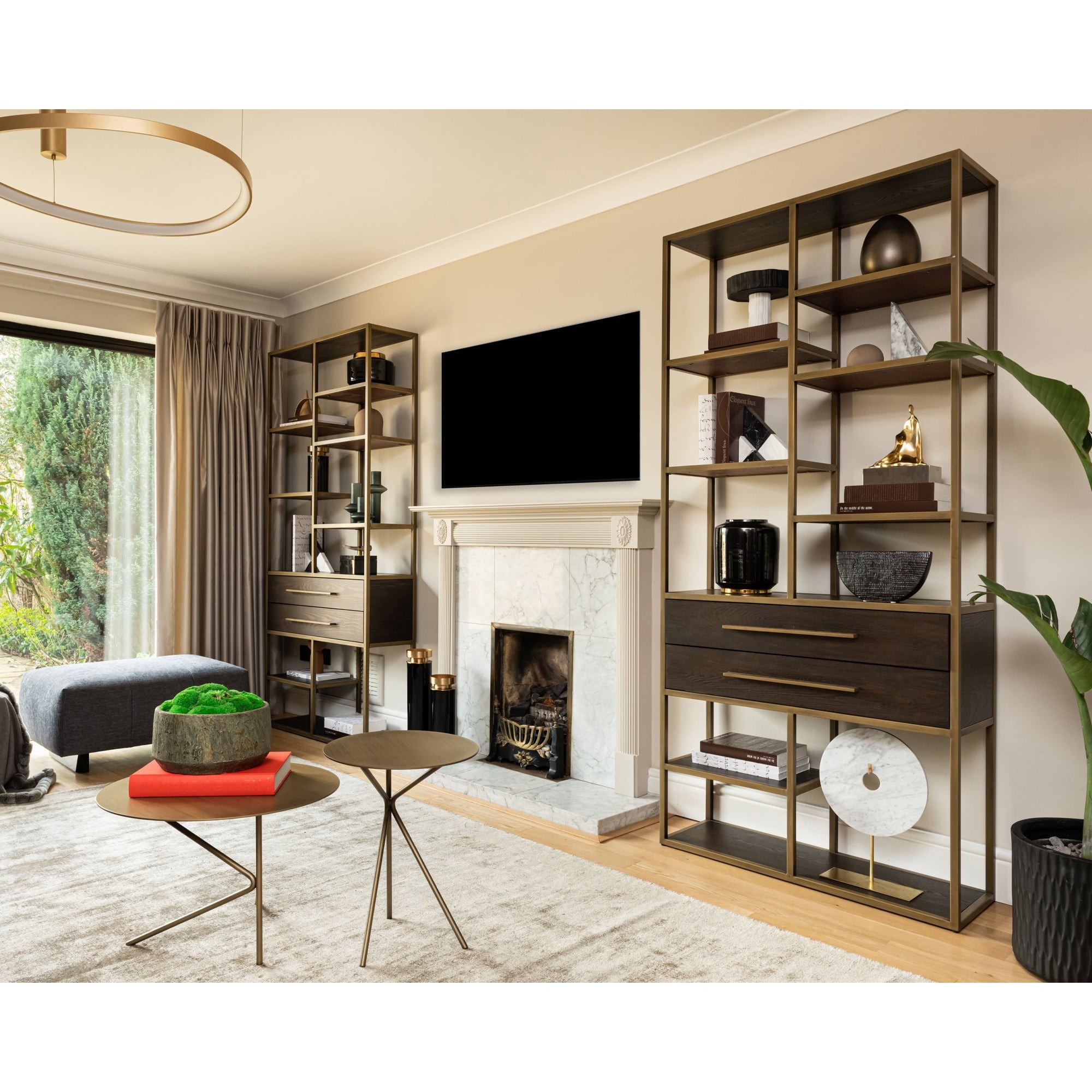 Enhance your living space with the elegant Mervyn Shelving unit, showcasing dark brown ash veneer complemented by a striking brushed brass frame. This meticulously designed shelving offers a perfect blend of style and practicality, featuring ample storage with discreet drawers and shelves, inviting you to curate your collection of books and accessories. A stunning focal point for both residential and hospitality settings.
