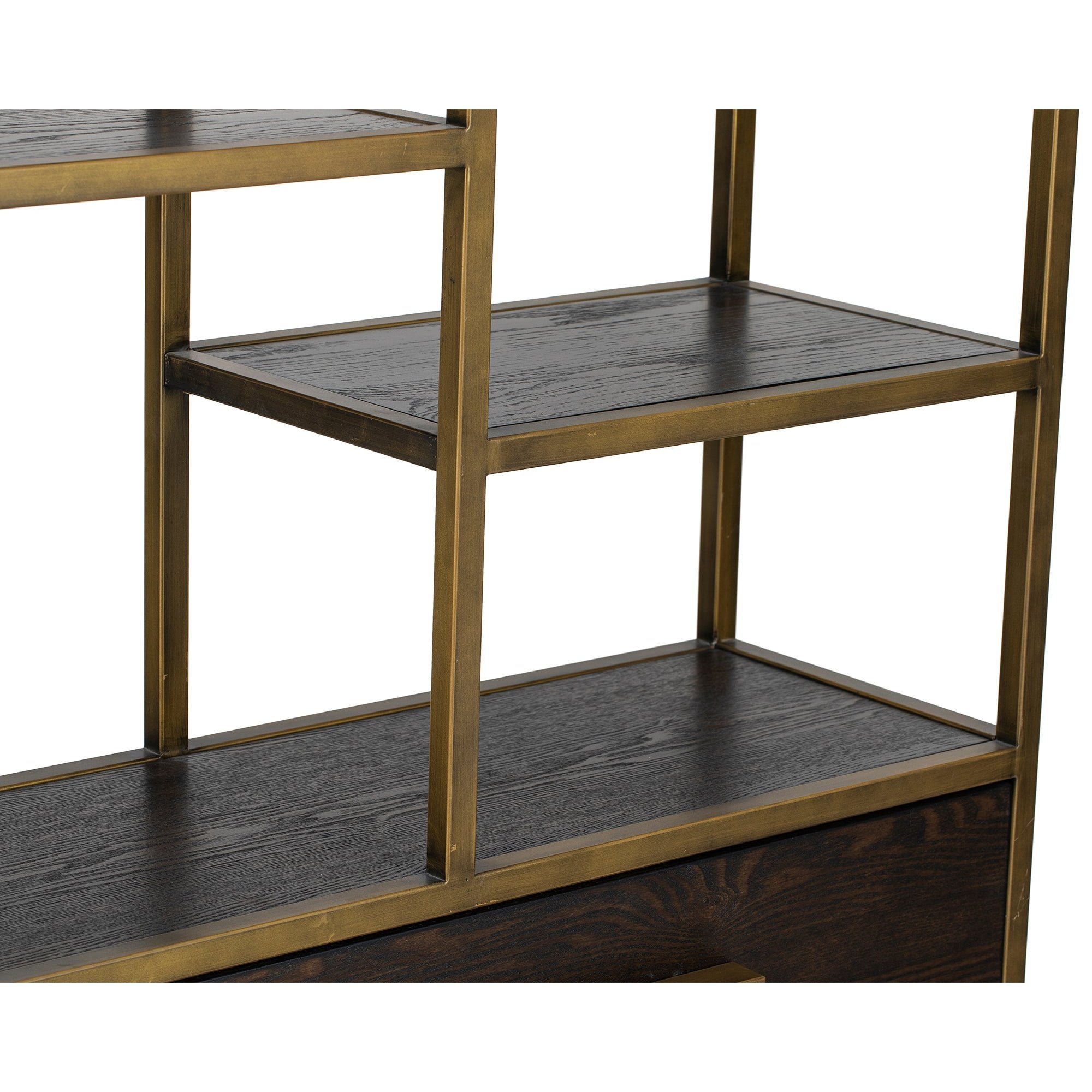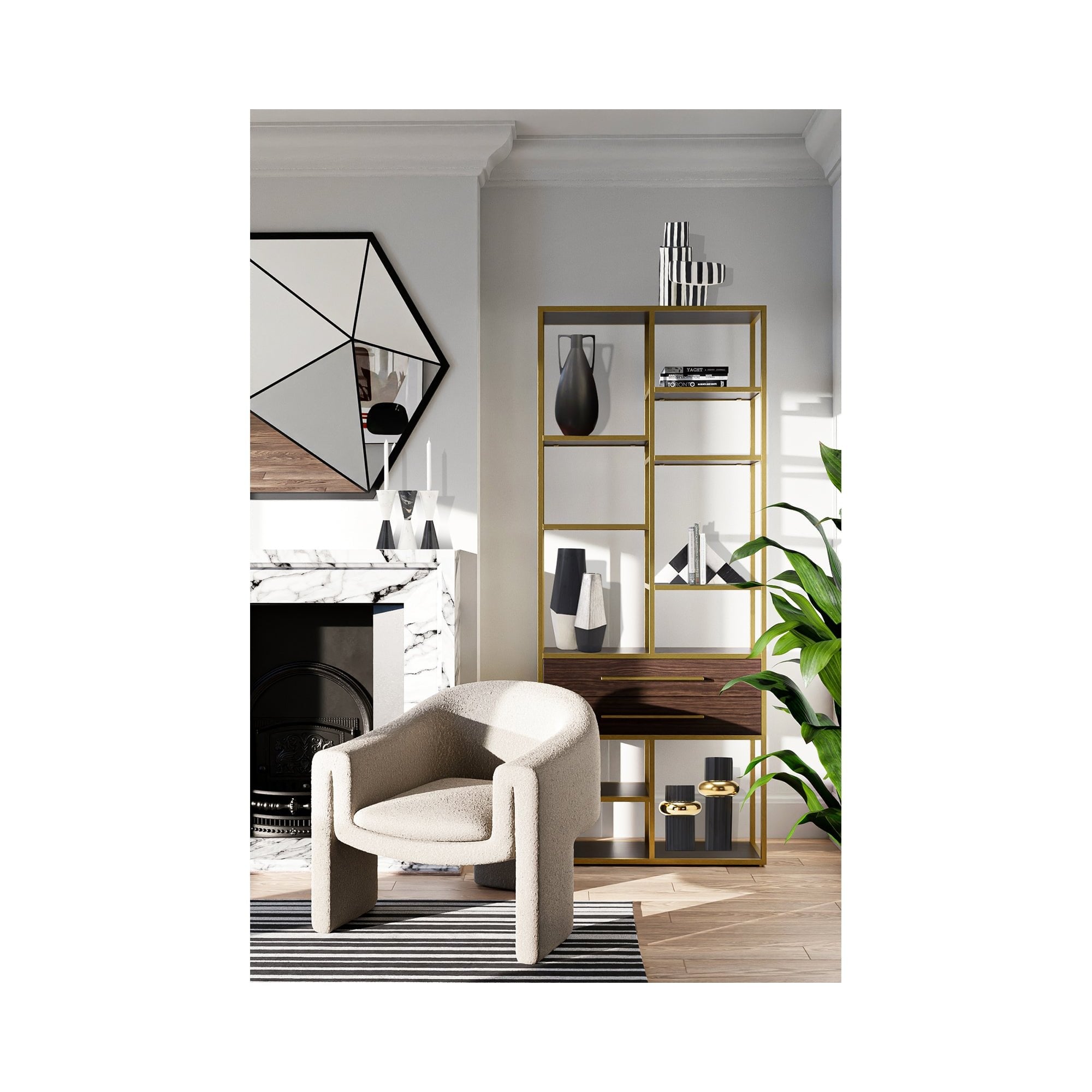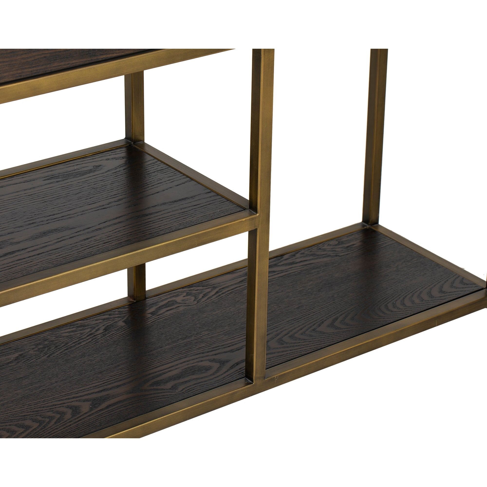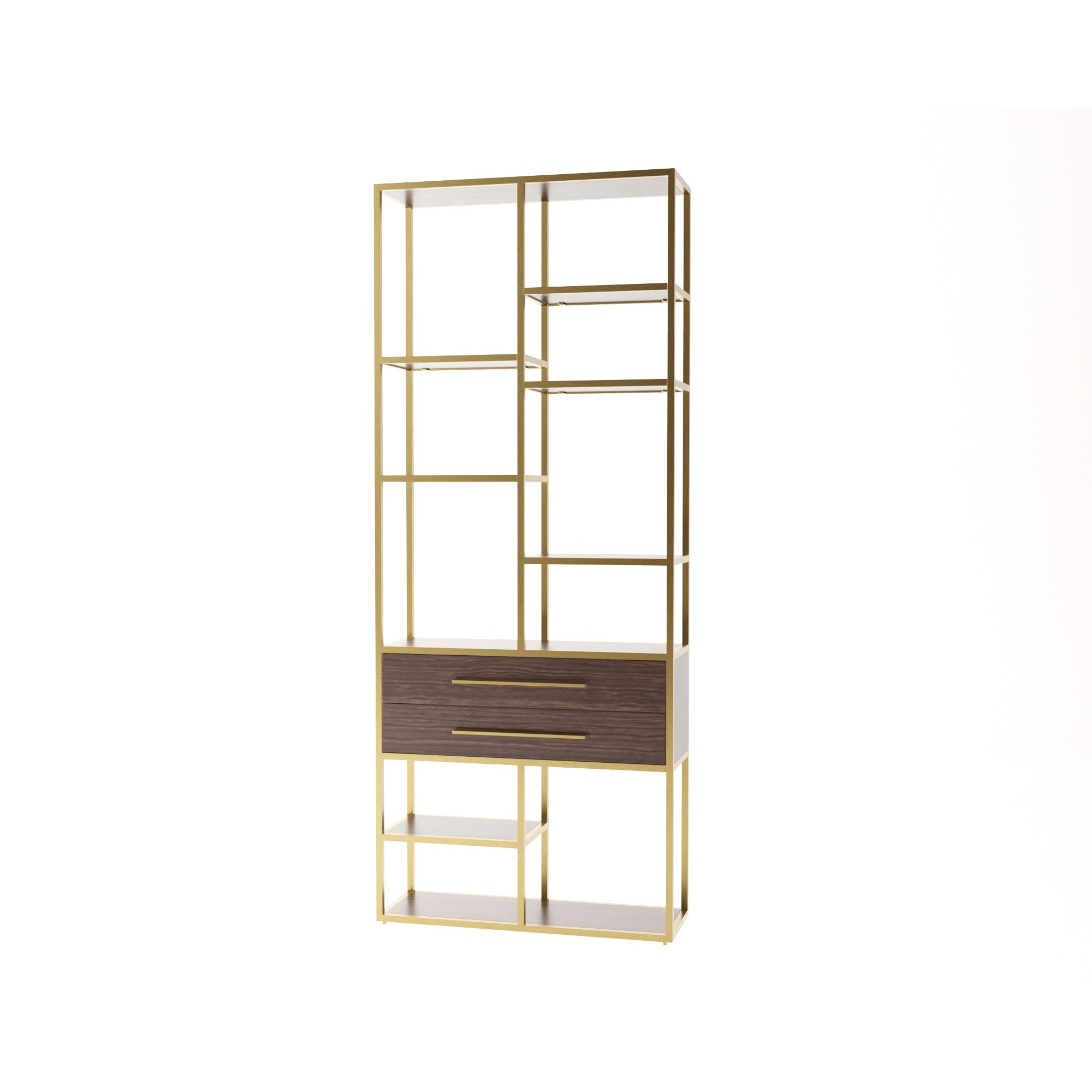 Enhance your living space with the elegant Mervyn Shelving unit, showcasing dark brown ash veneer complemented by a striking brushed brass frame. This meticulously designed shelving offers a perfect blend of style and practicality, featuring ample storage with discreet drawers and shelves, inviting you to curate your collection of books and accessories. A stunning focal point for both residential and hospitality settings.