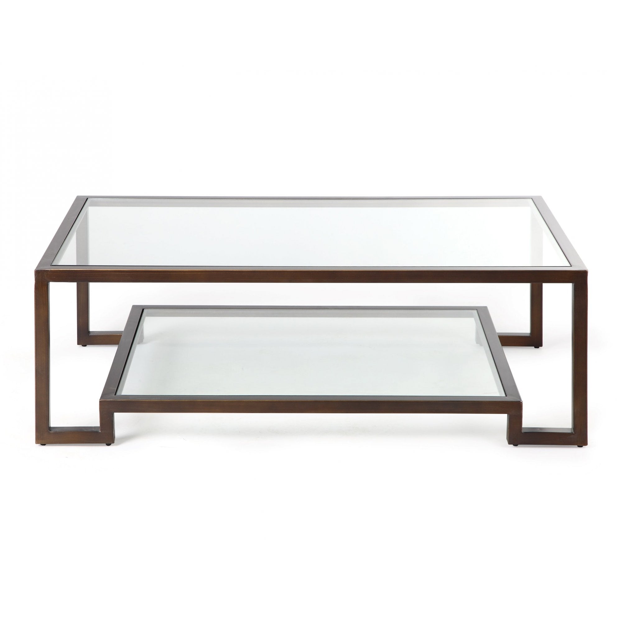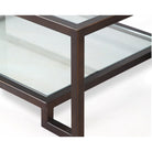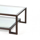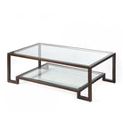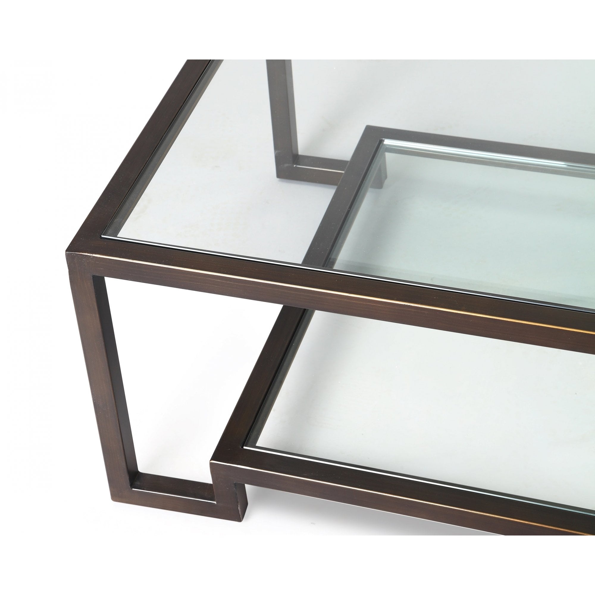 Ming Coffee Table with Antique Bronze and Glass Top. Elevate your living room with the exquisite Ming Coffee Table. Featuring a clear tempered glass top and a stylish undertier set in an antique bronze-coated steel frame, this table showcases a dual-surface design perfect for showcasing magazines or art books. The modern angular frame contrasts beautifully with the rustic bronze finish, making it an elegant yet versatile piece for any decor style—from minimalist to industrial. With its unique patina and tonal variations, it serves not just as a functional item but as a captivating focal point for your space.
