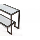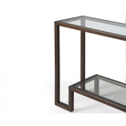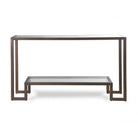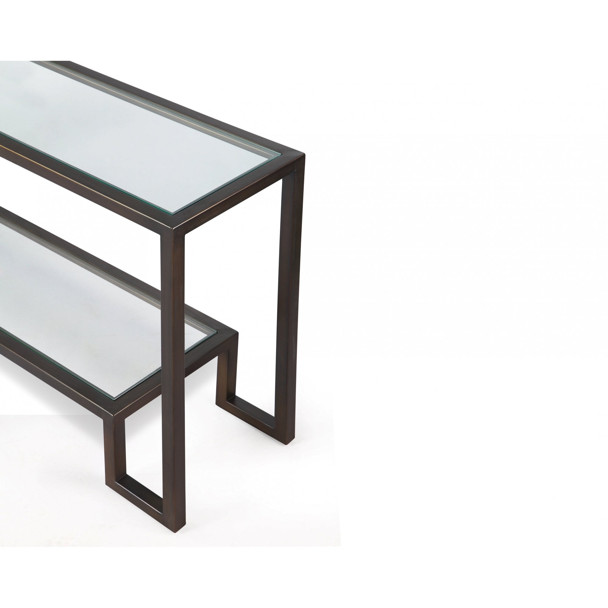 Elevate your hallway with the Ming Console Table, a stunning fusion of contemporary elegance and timeless craftsmanship. Handmade from robust steel with a sleek antique bronze finish, it features a clear tempered glass top and lower shelf. Perfect for displaying decorative items, it adds a luxurious touch to both residential and hospitality spaces.