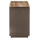 The Russo collection is manufactured in India using a metal cladding technique, in which a thin layer of metal is shaped by hand and attached to a wooden base. The design is similar to the Ironville but features a dark brown bronze metal finish. The tabletop is made of brown travertine, also known as titanium travertine, which gives the collection a warm and distinctive look.