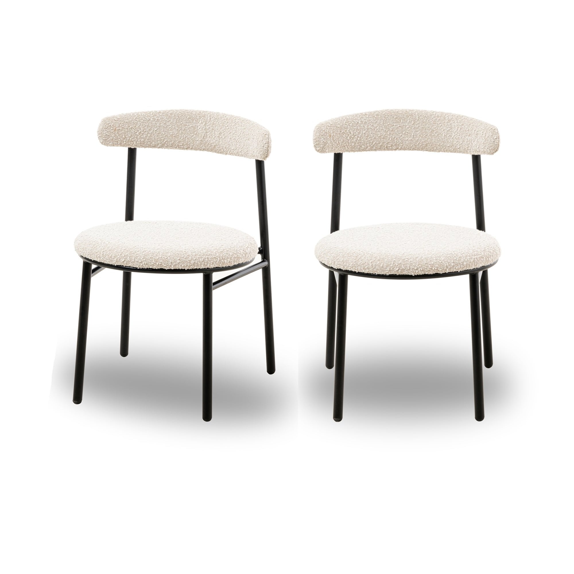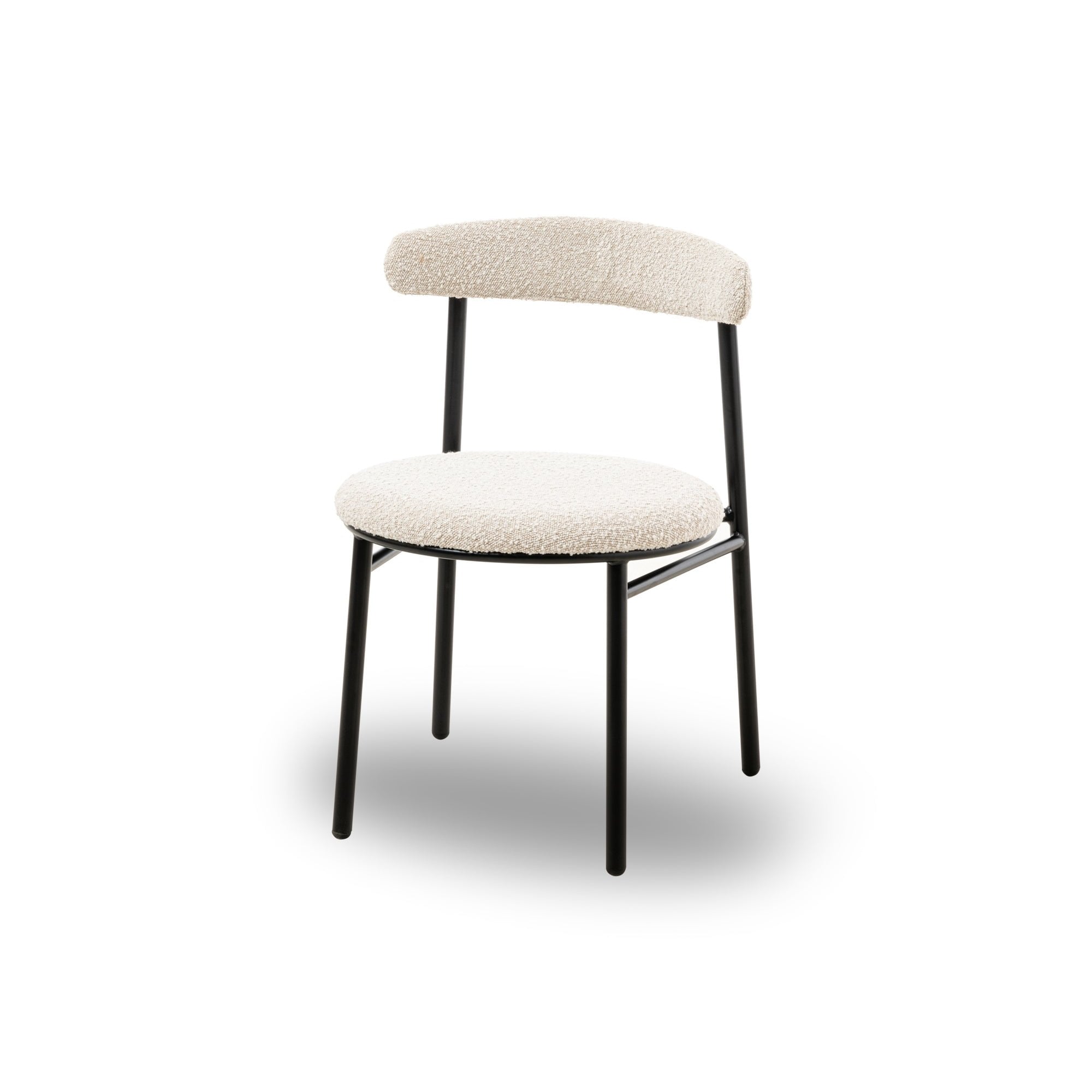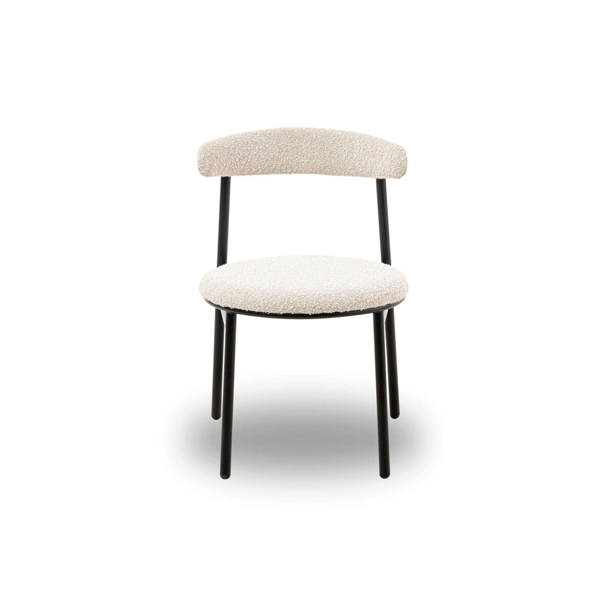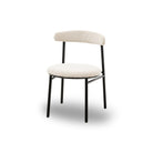 Elevate your dining experience with the Nook Dining Chairs, elegantly upholstered in soft boucle sand. Their sleek, rounded design in a matte black finish not only brings modern aesthetics to your space but also offers comfort and versatility. Perfect for both home dining rooms and hospitality settings, these chairs exude subtle elegance.